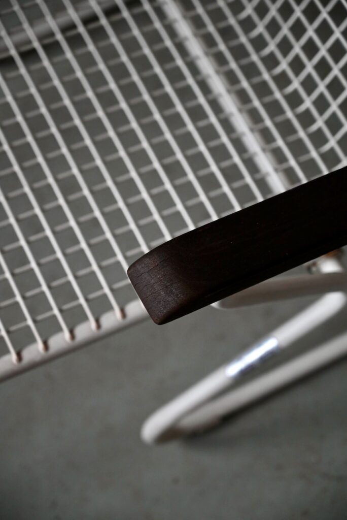 La chaise longue est de belle fabrication, à la fois simple solide et durable. Elle se présente en 2 parties séparables, son inclinaison est réglable. Quelques discrets manques de peinture sont à noter ainsi qu’une usure au niveau des galets du système de réglage de l’inclinaison. L’ensemble est en bel état, solide et durable. L’étiquette et le logo du fabriquant Erlau AG sont toujours présents.