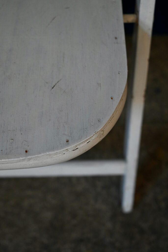 Dans l’esprit des productions Bauhaus, cette chaise pliante possède un design audacieux et fonctionnaliste. Réalisée en bois contrecollé et cintré, elle possède des dossiers et assises arrondis ; le tout est couvert d’une peinture vieux blanc patinée. Pratique et fonctionnelle, les chaises est pliable et dotée d’une poignée afin d’en faciliter la manipulation. Chaise d’appoint par excellence, elle sera parfaite en chaise de secours ou valet de chambre.