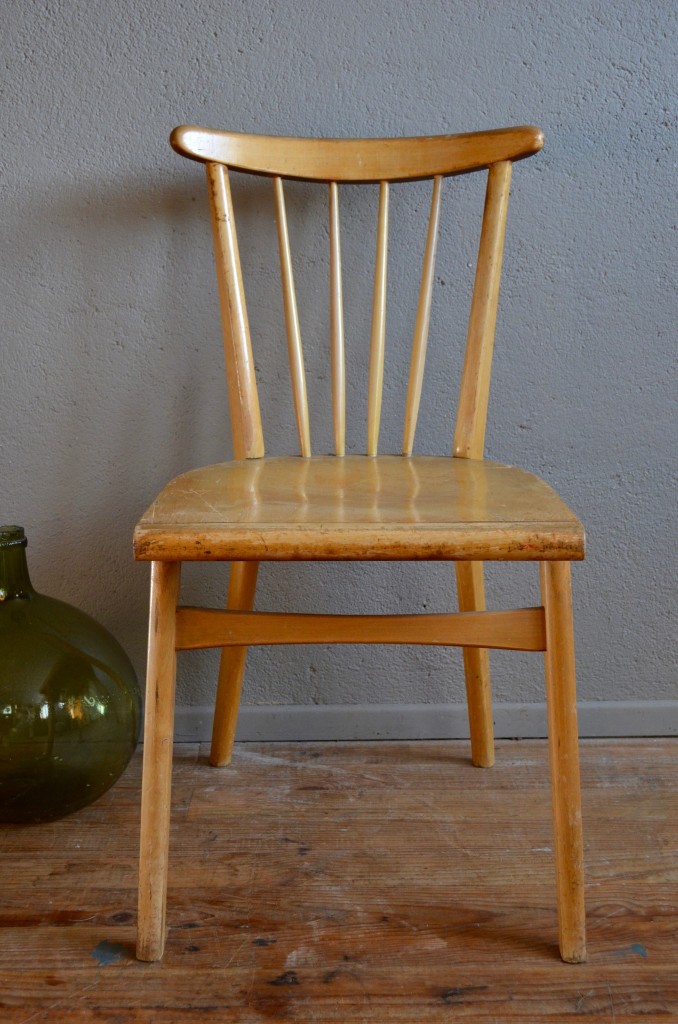 La chaise est en bel état, stable. Le bois est de teinte clair, doré. Quelques traces d’usage et rayures légères.