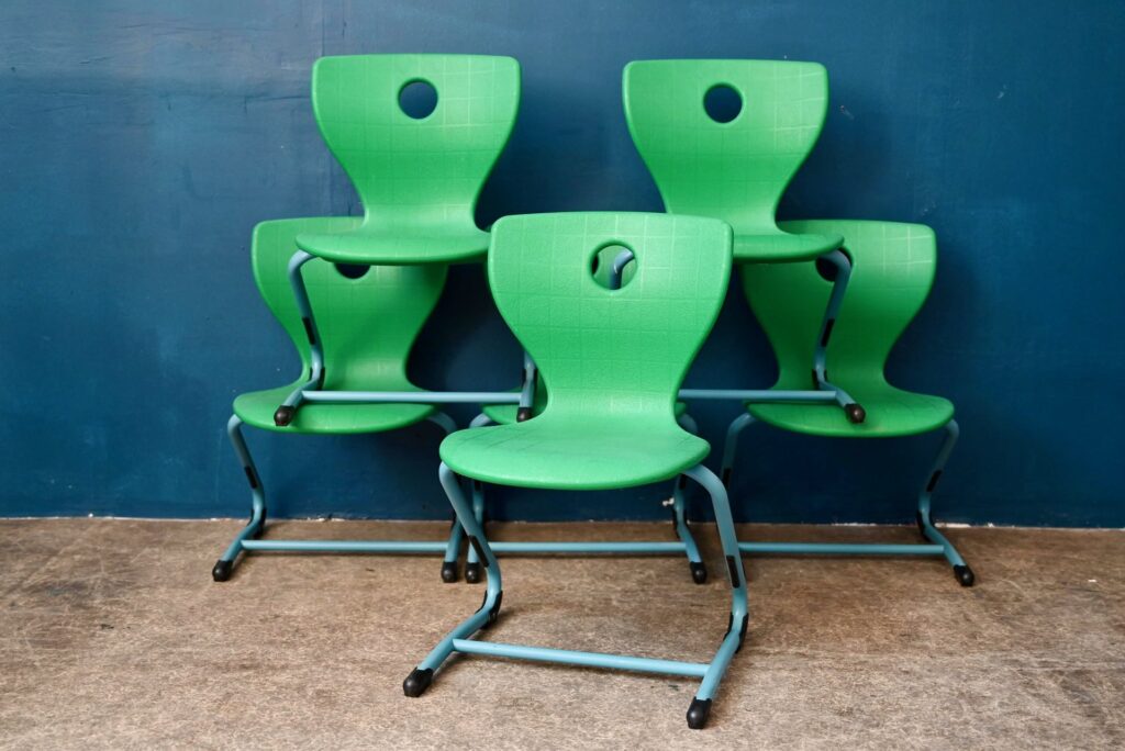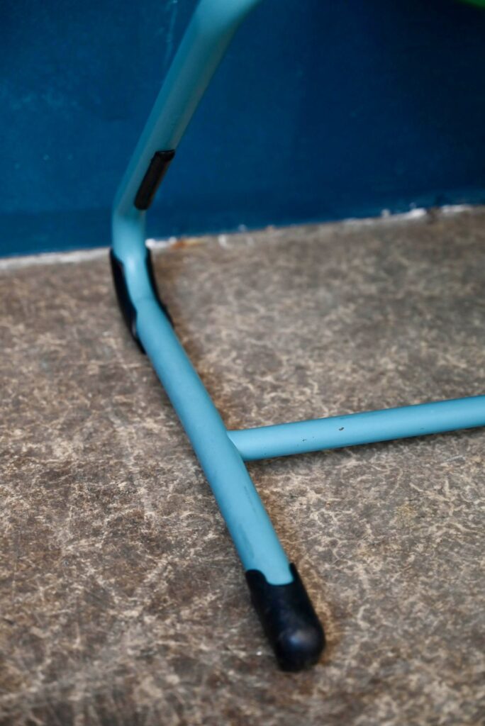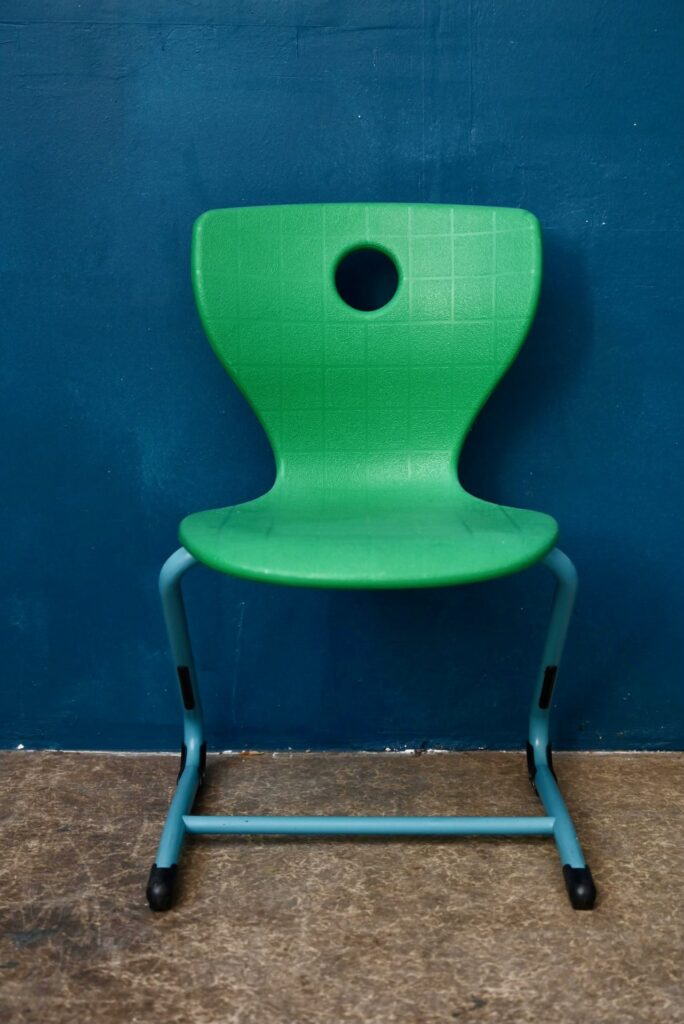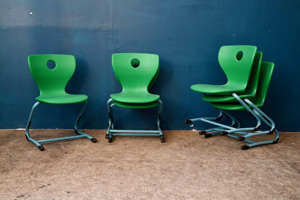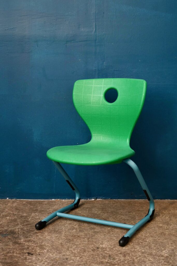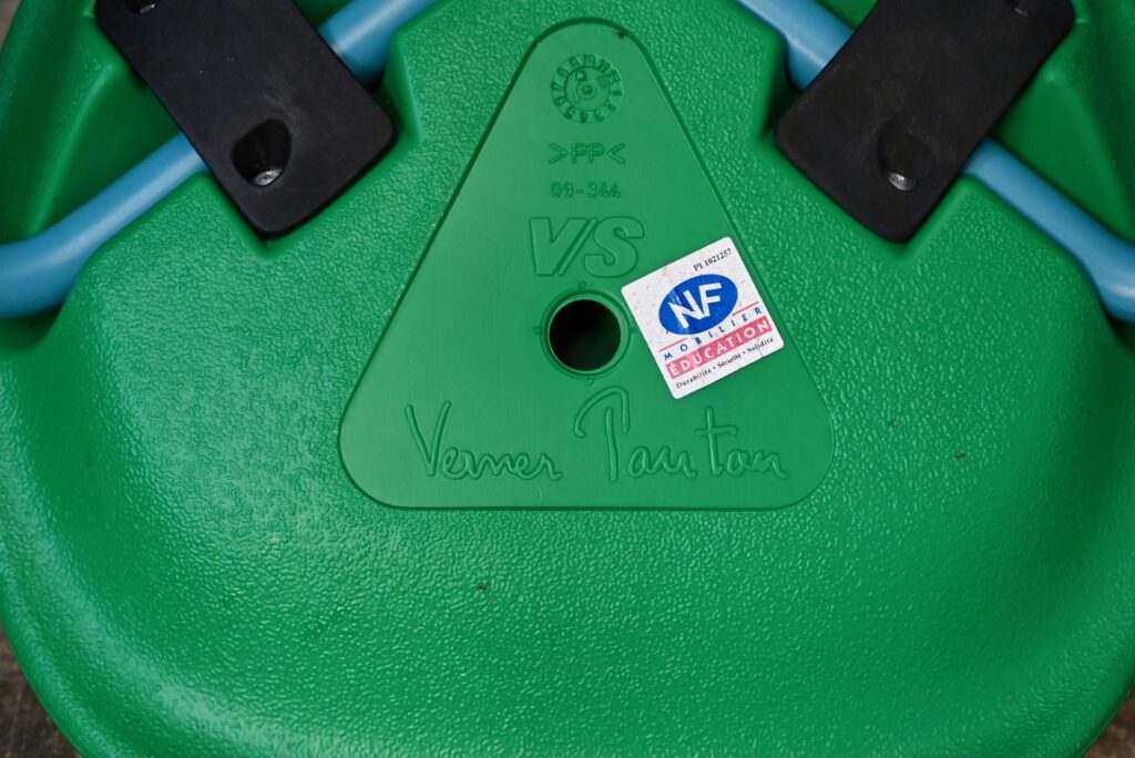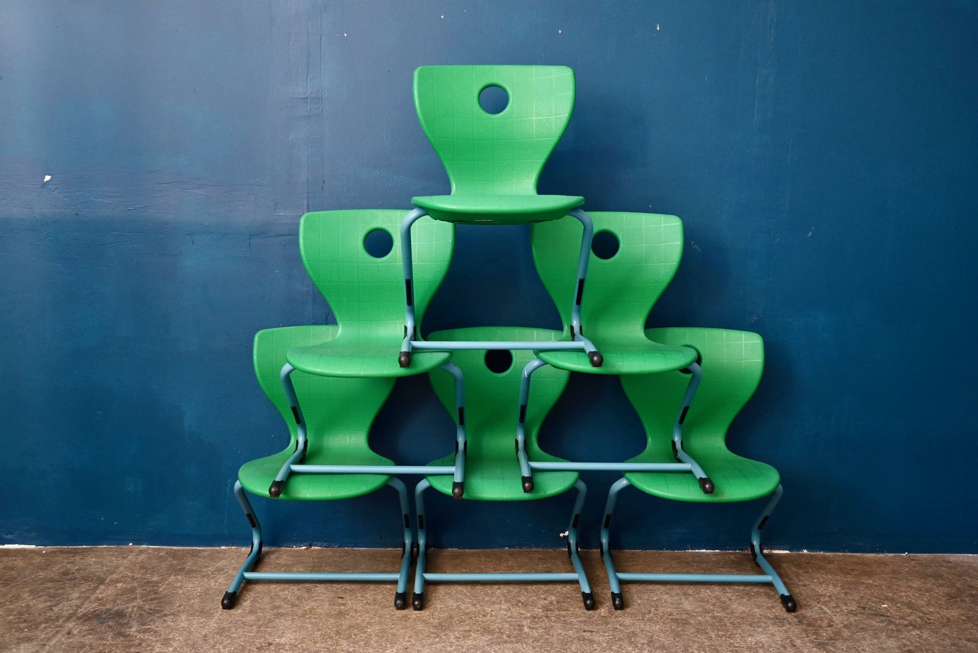 La coque moulée d’un seul tenant en polypropylène vert vif texturé percée d’un œil rond dans le dossier, repose sur un piétement en tube d’acier laqué bleu clair en porte-à-faux. Produites par VS, elles sont estampillées sous l’assise. Elles portent les petites marques d’usage.