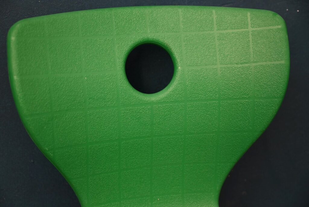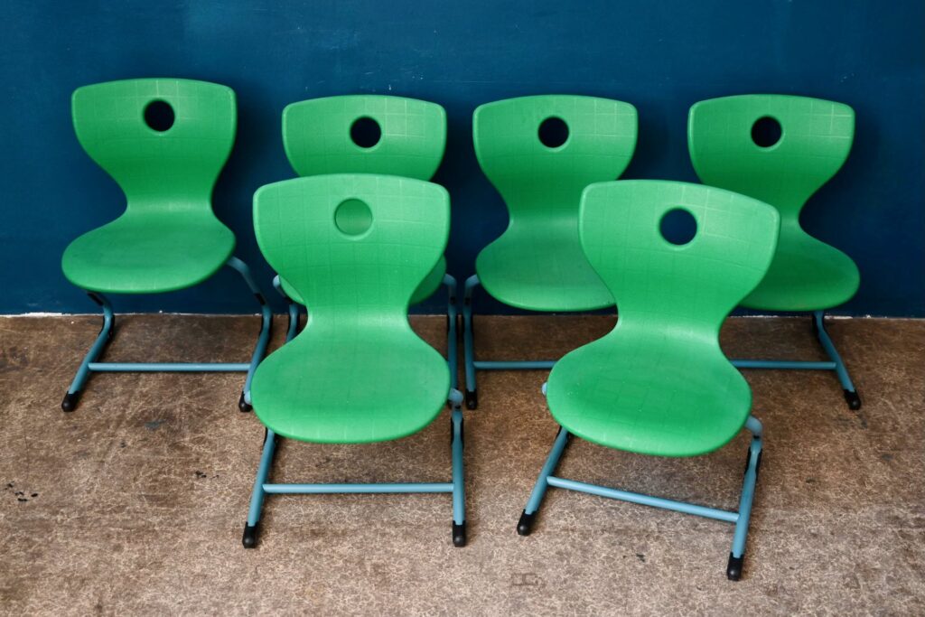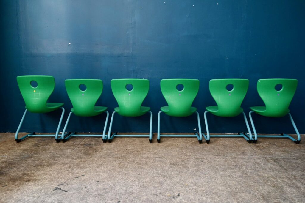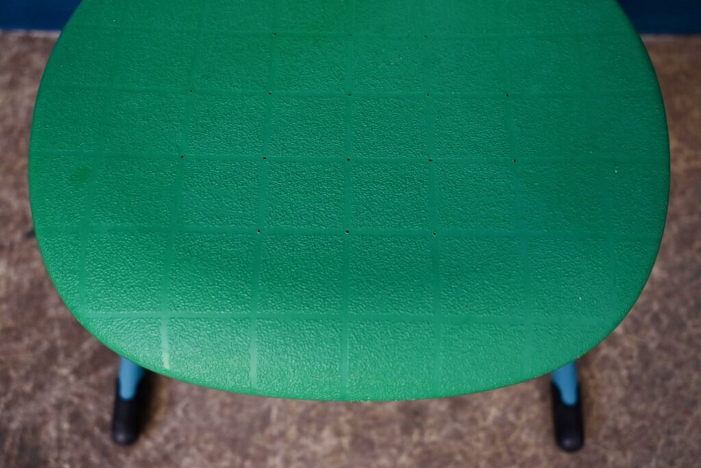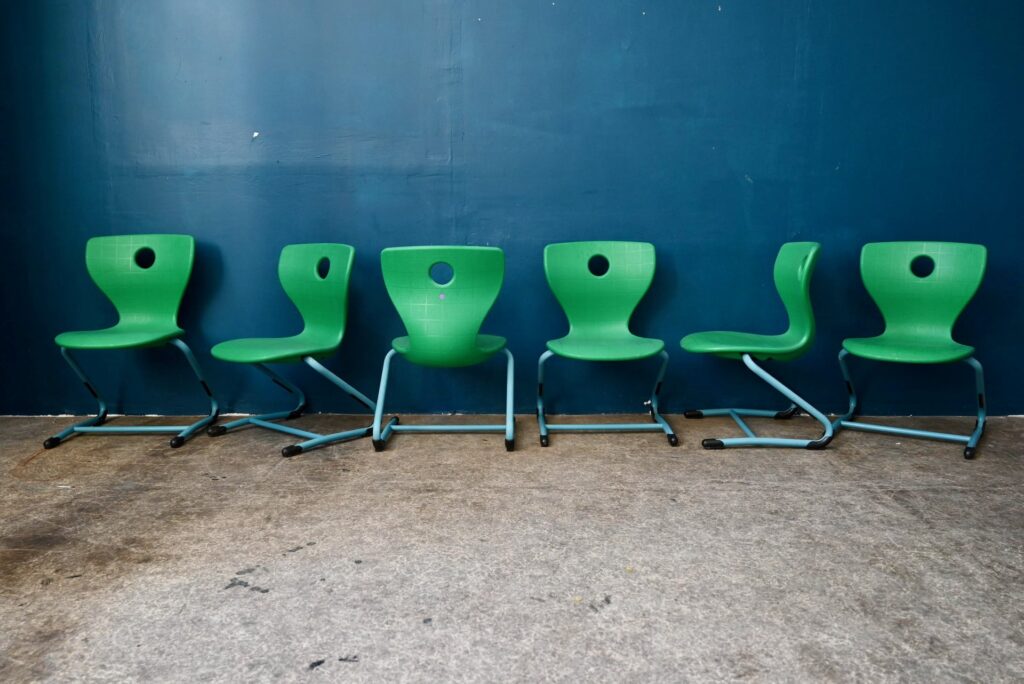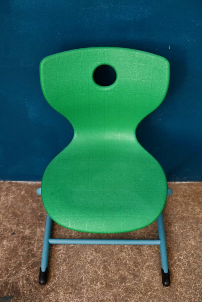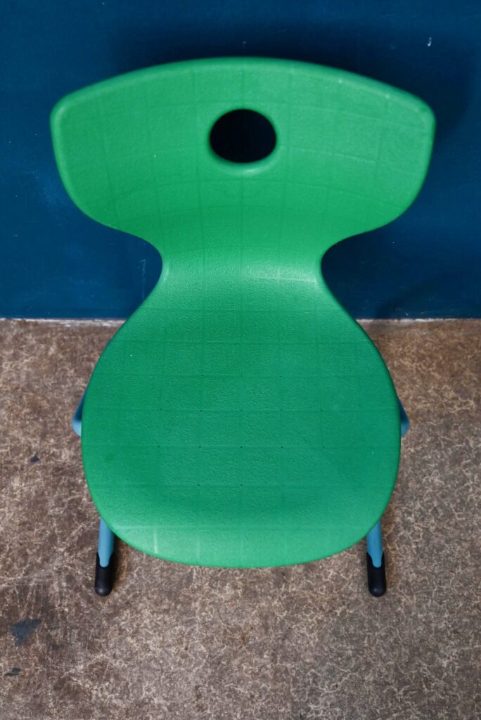 La coque moulée d’un seul tenant en polypropylène vert vif texturé percée d’un œil rond dans le dossier, repose sur un piétement en tube d’acier laqué bleu clair en porte-à-faux. Produites par VS, elles sont estampillées sous l’assise. Elles portent les petites marques d’usage.