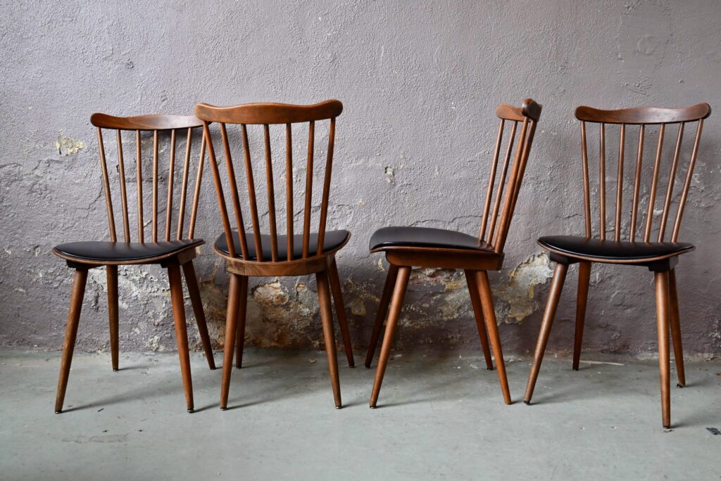 Piétement et barreaux sont en hêtre massif. L’assise est en skaï noir. L’ensemble est bon état, avec des traces d’usage légères. La série est constituée de 4 chaises.