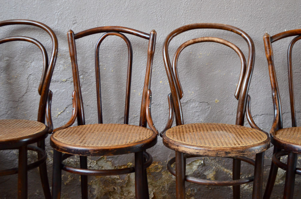 Les chaises sont en bois courbé et datent des années 1900. Elles sont dépareillées, deux modèles différents. Le cannage est en bel état, les assises confortables et stables.