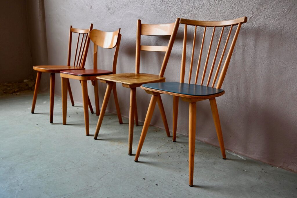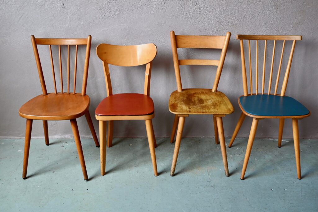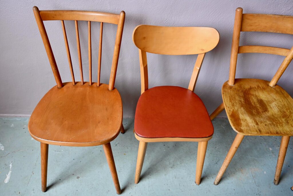 Toutes bistrot, blondes, skaï rouge et skaï bleu… Élégantes mais différentes! Esprit “Mix & match” pour cette série de chaises de cuisine des années 50. Dans une ambiance vintage et bohème, cette série de chaises est constituée de 4 modèles différents, toutes en bois blond. Solides et indémodables, ces chaises vintage s’accordent à merveille. Authentiques, elles seront parfaites autour d’une jolie table de ferme dans une cuisine conviviale.