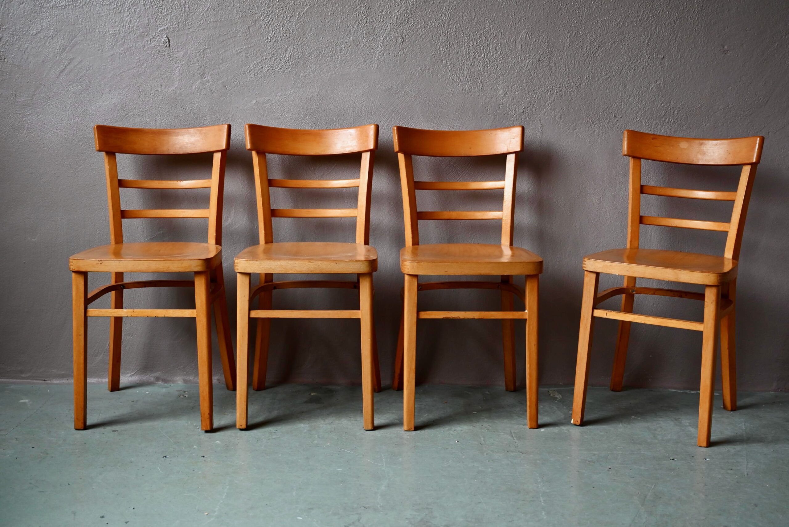 Les 4 chaises sont en hêtre. Elles ont été utilisées et présentent quelques très légères traces d’usage. Elles sont estampillées Baumann sous l’assise. L’ensemble est en bel état, cohérent, stable, robuste, homogène et possède un look bistrot vintage. Nous aimons le dossier confortablement incurvé et la teinte dorée et lumineuse. Ces chaises anciennes sont de belle fabrication.