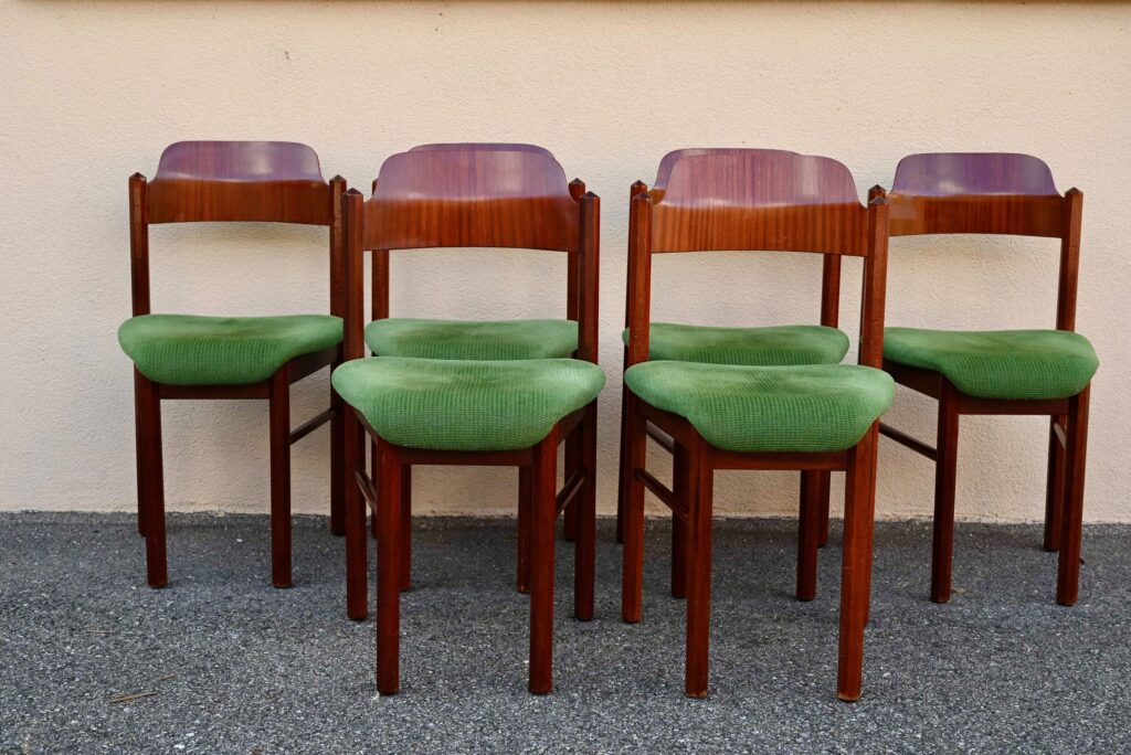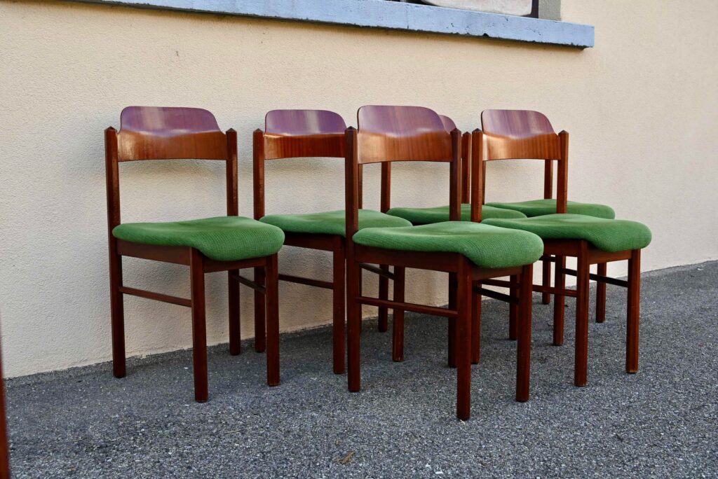 Cette incroyable série de chaises rétro possède des lignes vraiment hors du commun! Avec leur garnissage en velours vert, leurs assises effilées, elles proposent une certaine idée du confort. La structure de teinte teck affiche des lignes dynamiques voire brutalistes, des montants de section octogonale, des arêtes saillantes et un dossier courbe et confortable. Ces chaises seront des pièces de choix dans le salon, leur confort sera l’allié des soirées sans fin!