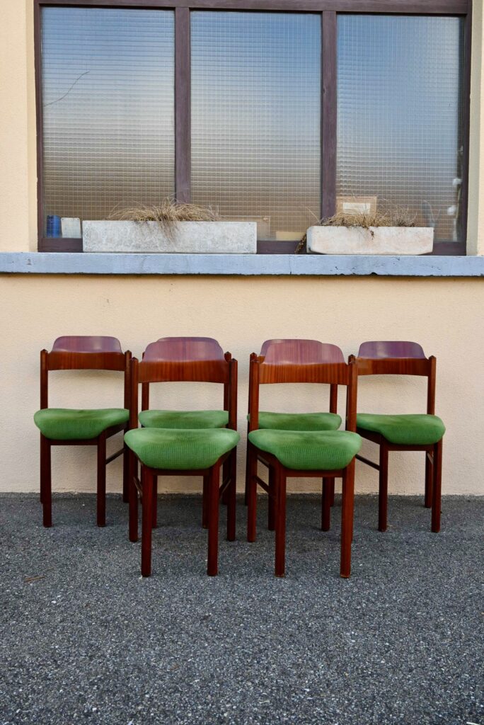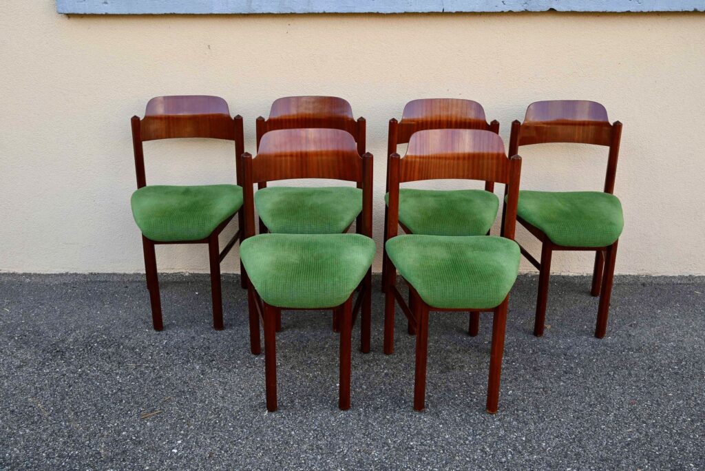 La structure des chaises est en bois massif, du hêtre de teinte teck profonde. Le dossier est en contreplaqué courbe. Les assises sont épaisses, couverte d’un tissu velours vert très propre. De forme particulière, les pieds avant sont resserrés et portent donc une assise de forme effilée. Elles sont en bon état, confortable et stable, en plus d’être très originales. Il est possible de constituer des séries sur demande.|