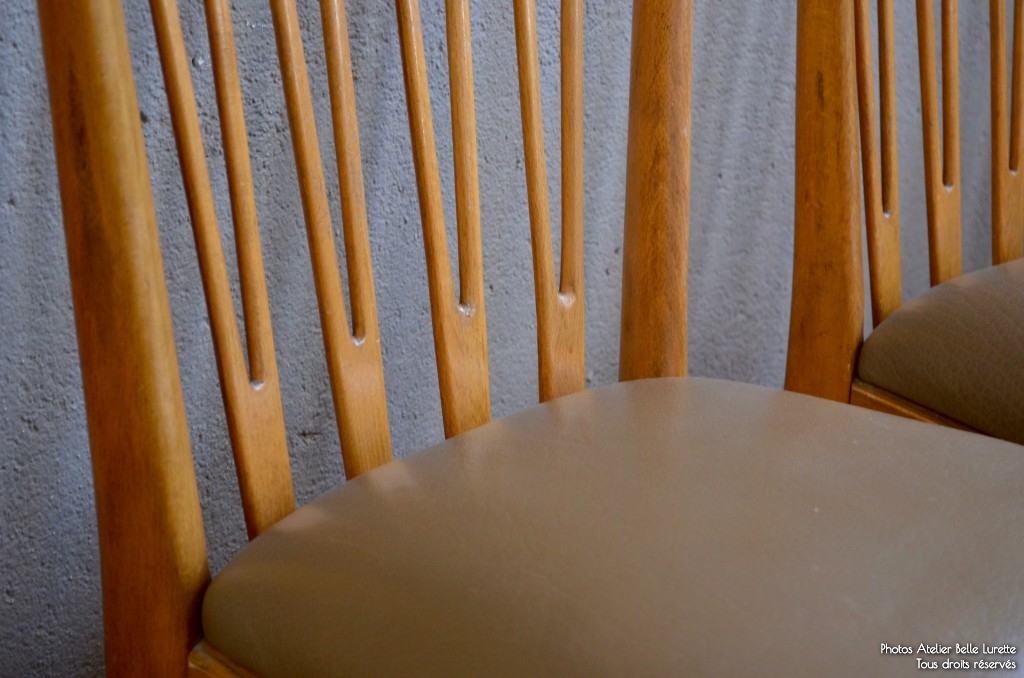 Les chaises sont en hêtre massif (piétement et dossier) et placage. Le dossier est tout en rondeur et travaillé avec finesse, dans l’esprit des chaises dessinées par Charles Ramos. Les assises sont confortables et rebondies, le skaï est en parfait état. Une réparation ancienne discrète sur le dossier d’une des chaises est visible sur une des photos. Les chaises sont très confortables, stables et en parfait état.