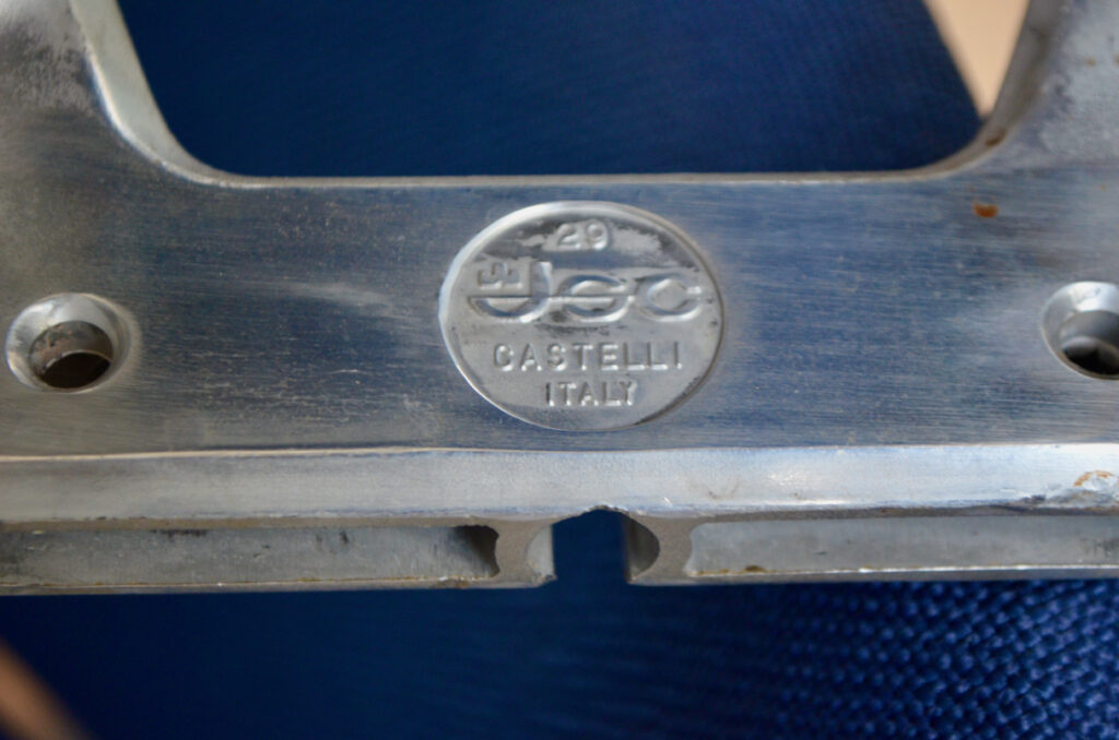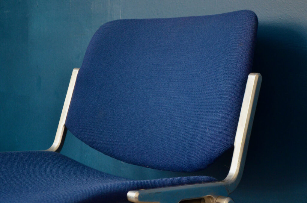 La chaise de bureau DSC a été dessinée par Giancarlo Piretti pour Castelli, elle date des années 70. Elle est estampillée sur la structure métallique. Les chaises sont en bel état, quelques rayures sont visibles sur le piétement. Le tissu est d’origine. De teinte bleu roi, la série est homogène. Le tissu présente quelques traces d’usage mais est en bon état, sans trou ni accroc. Les chaises sont empilables.