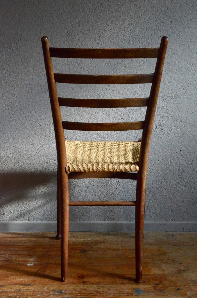 Cette superbe série de chaises des années 50 est séduisante! Les lignes élancées, le mariage parfait des matériaux, la finesse des détails évoquent le design de Colombo Sanguineti ou des célèbres « Supperleggera » de Gio Ponti. L’incroyable légèreté de ces chaises n’enlève rien à la robustesse des pièces et adoucit leur petit côté rustique. Nous aimons le caractère authentique qui se dégagent de cette série de chaises rétro, et le confort d’assise remarquable!