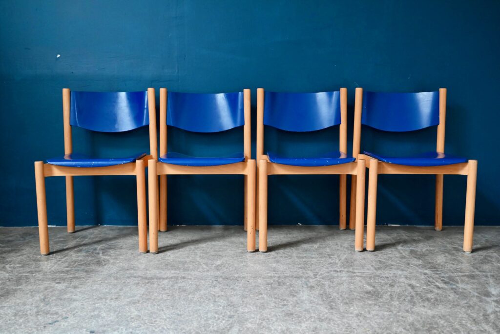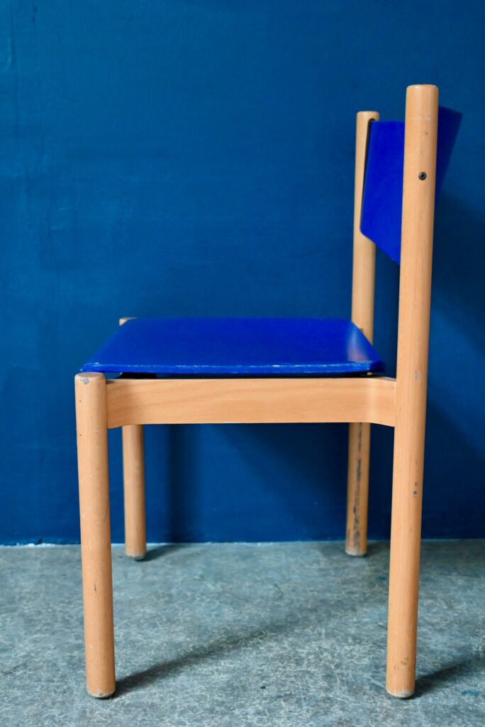 Les chaises sont anciennes et datent des années 60. Le piétement est en bois massif de teinte claire et dorée. Assise et dossier sont en contreplaqué thermoformé, offrant une bonne ergonomie. La peinture bleu est d’origine, patinée par endroit. Les chaises sont empilables, stables et très costaudes. Nous en avons une grande série.