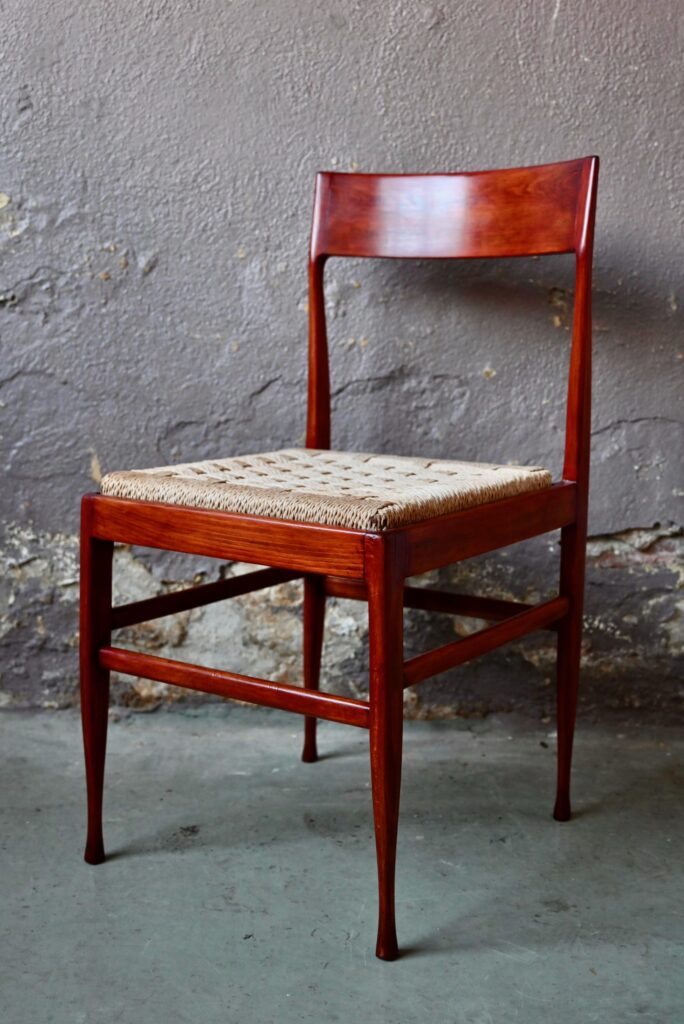 Bellissima! La structure de ces chaises des années 60 est d’une finesse stupéfiante, mettant en avant la teinte profonde et flamboyante du teck. Le dessin minimaliste mise sur les détails élégants et l’alchimie des matières. Le dossier incurvé des chaises et le fin sabot sculpté en partie basse du piétement confèrent une touche organique et sensuelle. L’assise en corde tressée de ces somptueuses chaises italiennes est superbe, graphique et contrastante, et apporte un grain fou à cette série d’assises élégantes.
