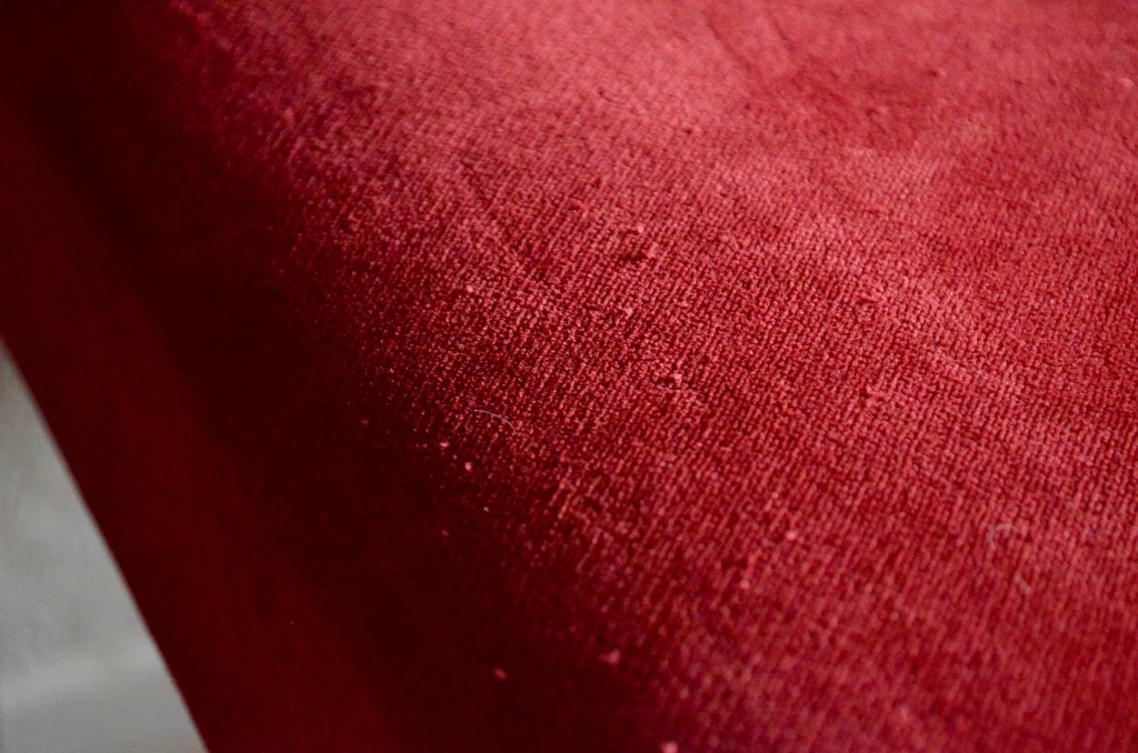 Cet ensemble de chaises en teck des années 60 affiche de superbes lignes et un look résolument scandinave. A la fois fines et sobres, on aime le piétement fuseau, le galbe du dossier et le contraste des matières de ces chaises. Teinte et veinage du teck massif sont mis en valeur par le velours rouge carmin et le travail tout en courbe des pièces de bois.