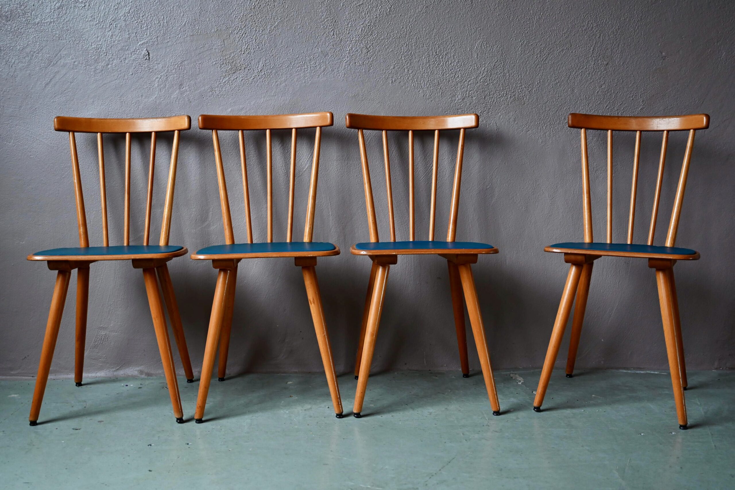 Les chaises sont anciennes et datent des années 60. En bois, elles ont une teinte dorée chaleureuse, joliment patinée. Elles présentent des traces d’usage discrètes. Le piétement compas et les barreaux sont fins et apportent dynamisme et légèreté aux chaises. Elles sont costaudes, stables et confortables. Elles disposent d’assise en skaï bleu. Celui-ci est en bel état. Des traces d’usage sont visibles en photo. Nous disposons d’une série de 20 chaises et pouvons constituer un lot à la demande, n’hésitez pas à nous contacter.