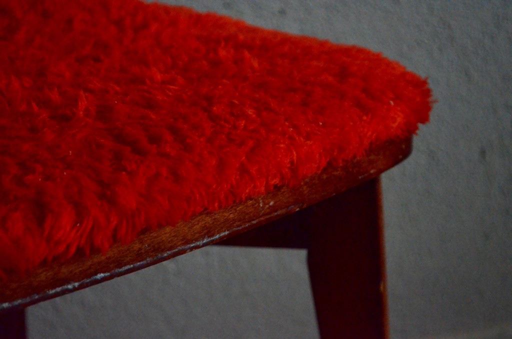 La structure de la chaise est en bois et placage d’une teinte sombre. Assise et dossier sont recouvert d’un tissu moumoute rouge, lumineux et en très bel état. L’ensemble est stable et confortable. Le prix comprend la paire.