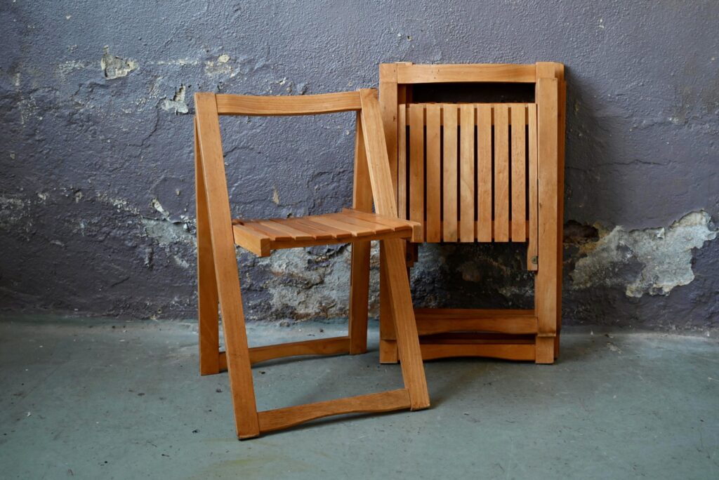 Les chaises pliables sont en bois massif et lattes de bois. La teinte est dorée. Elles sont anciennes et en bel état, quelques traces d’usage sont visibles. Les chaises sont élégantes, stables et faciles à plier/déplier. Le tarif est indiqué pour la série de 4 chaises.