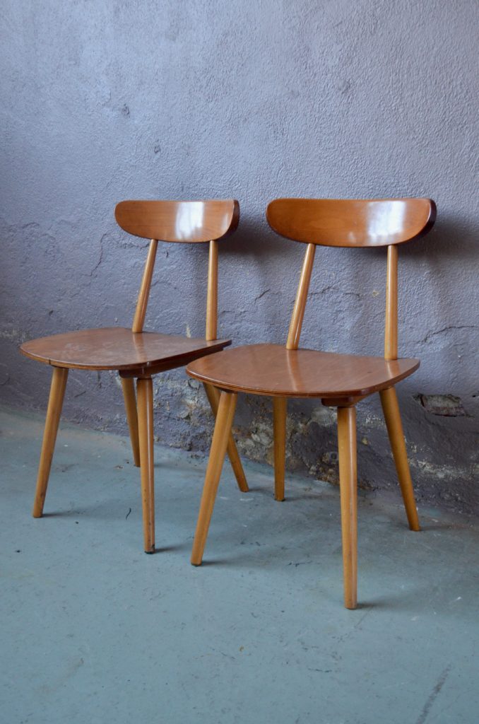 Les chaises bistrot sont en bois de teinte claire dorée datent des années 50. Elles sont en bel état, patinées par endroit. Elles sont solides, bien réalisées et très stables. Des traces d’usage discrètes sont visibles. Le tarif est donné pour la paire de chaises.