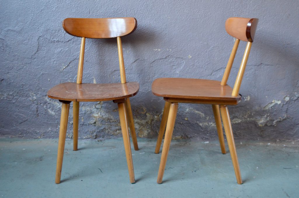 Voici une jolie paire de chaises bistrot des années 50 aux accents scandinaves! Éditées par Hiller, manufacture allemande, ces chaises vintage en bois sont pleines d’élégance. Leurs lignes peu communes sont minimalistes et faciles à associer. La série est constituées de deux paires de modèles identiques mais teintées en clair et en foncé. Le piétement compas est élancé, et semble se poursuivre dans les montants du dossier. Le design simple évoque le mobilier rustique et primitif, relu avec modernité. Nous aimons beaucoup cette chaise qui fait dialoguer tradition et modernité, légèreté et robustesse.