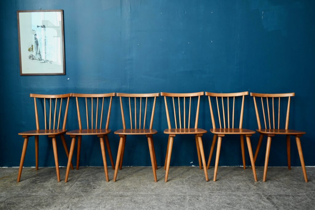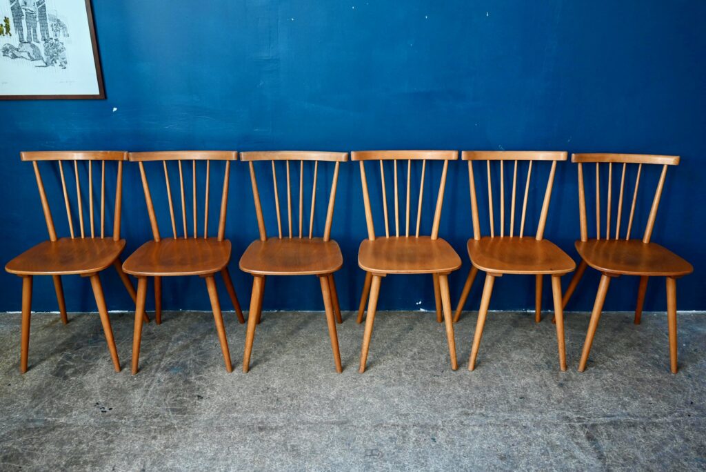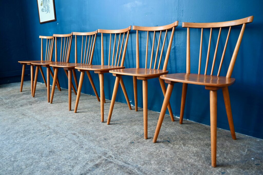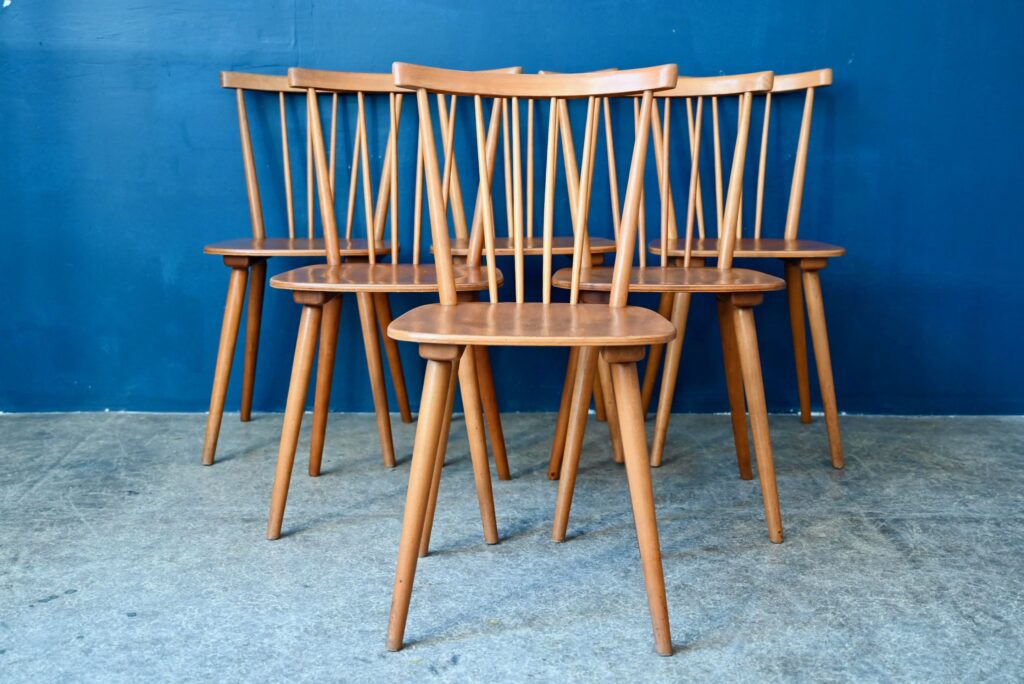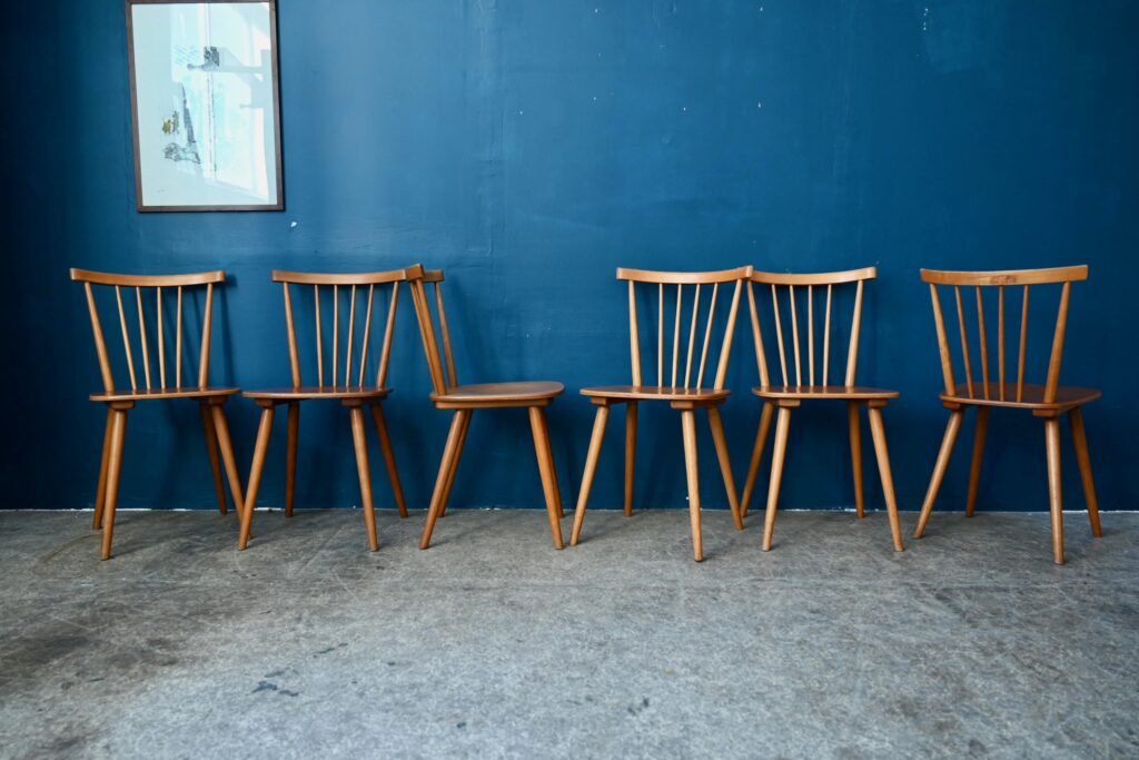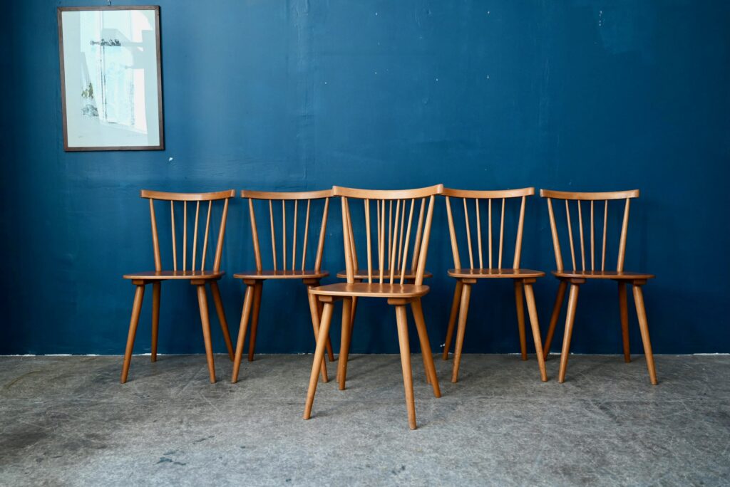Cette jolie série de chaises possède un look des années 60, à la croisée du modernisme fonctionnel et de la douceur du design scandinave. Nous apprécions leur simplicité élégante, leur look chaleureux et leur fabrication rigoureuse. Autour d’une jolie table chinée, nul doute que ces chaises à barreaux feront mouche.