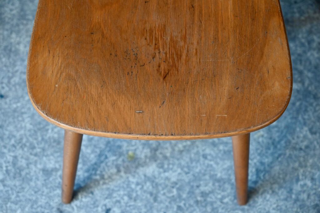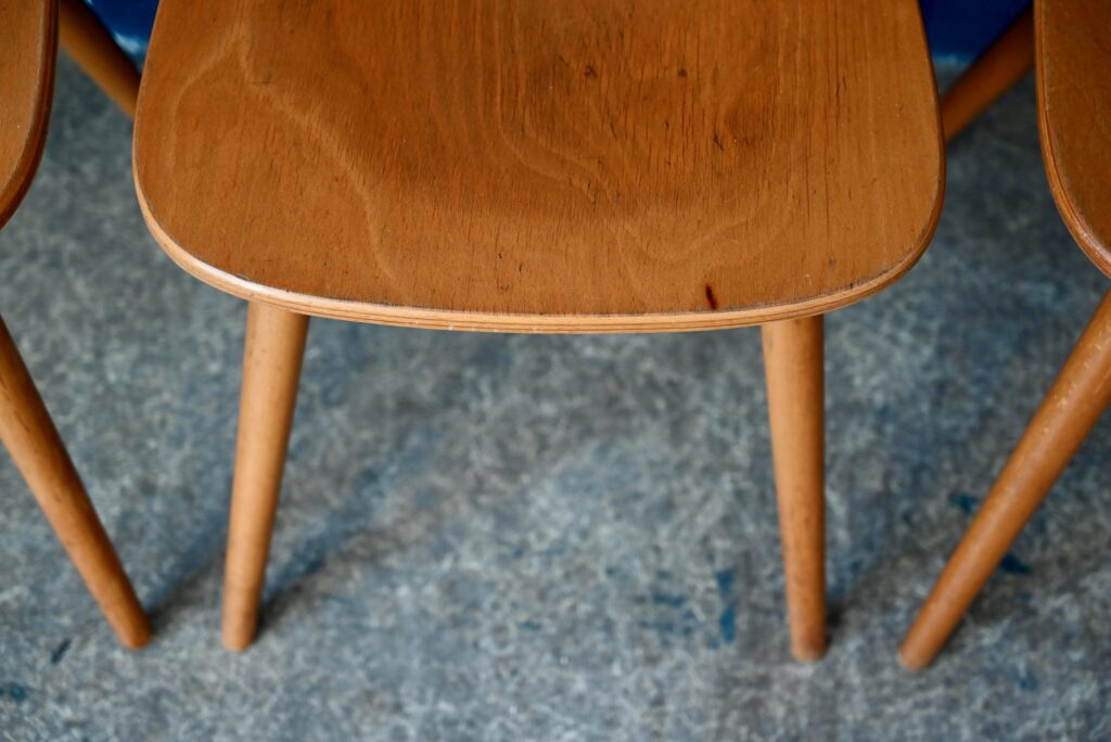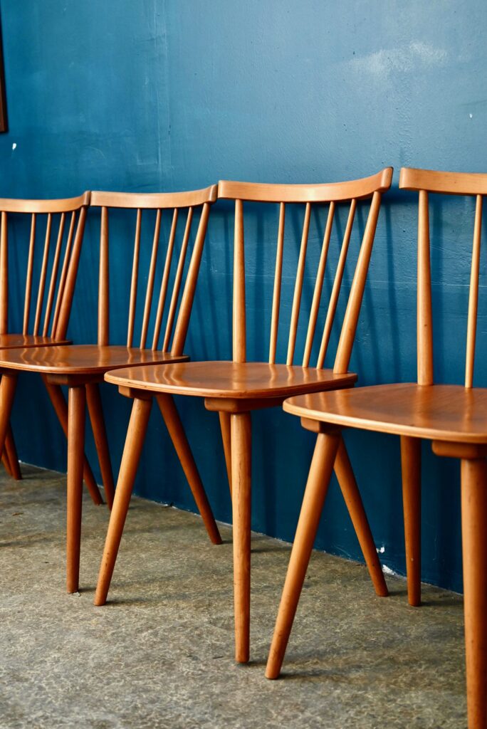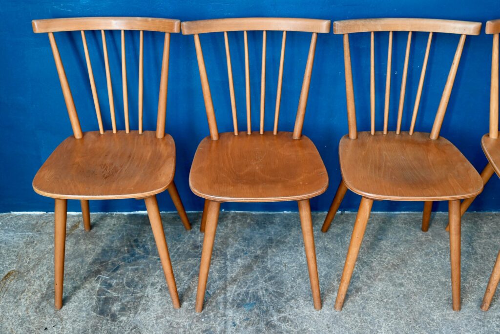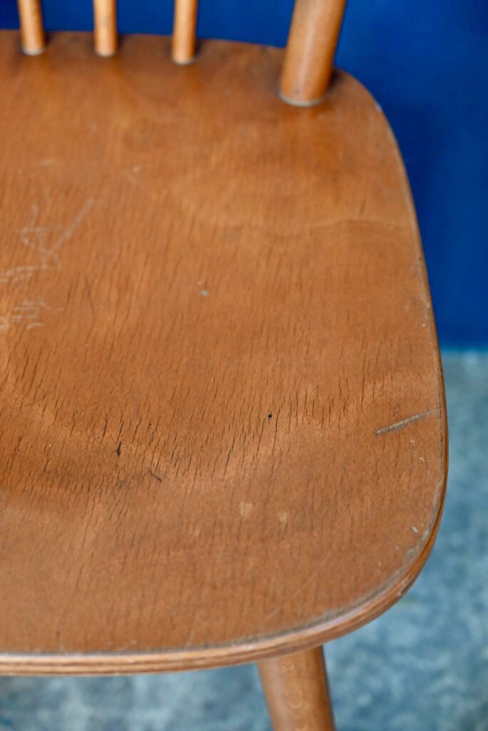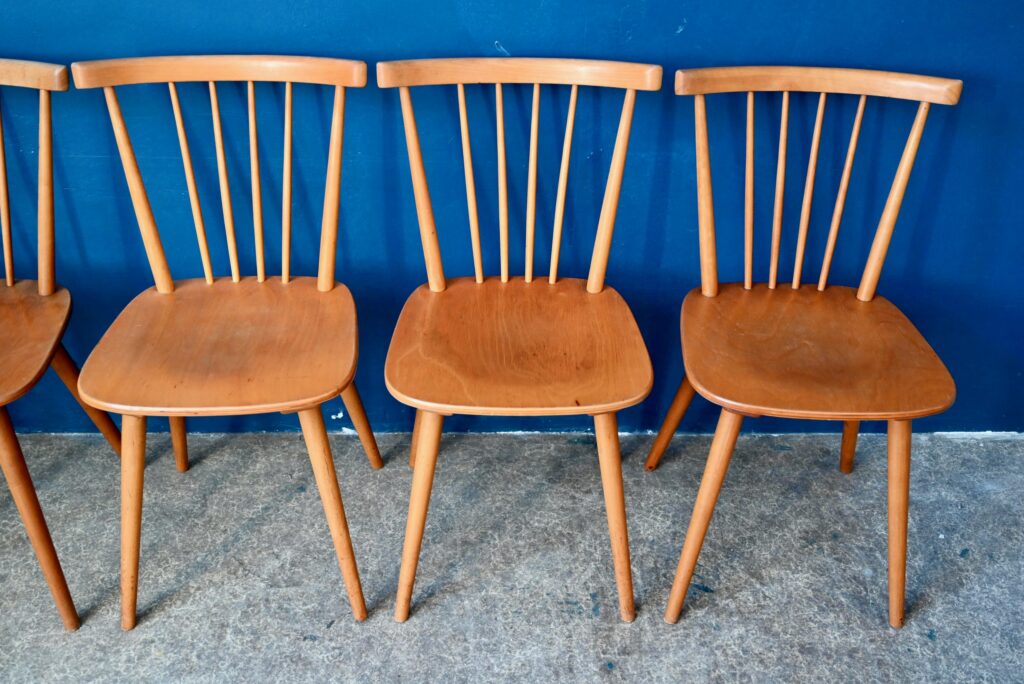 Piétement et barreaux sont en hêtre massif, de très belle facture. Les chaises sont anciennes, parfaitement stables et confortables. Elles sont dans une teinte dorée et claire. Elles sont robustes et en bel état. Elles présentent des traces d’usage minimes.