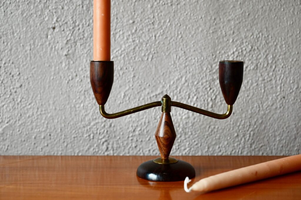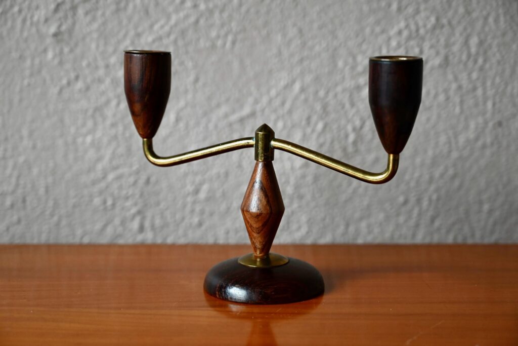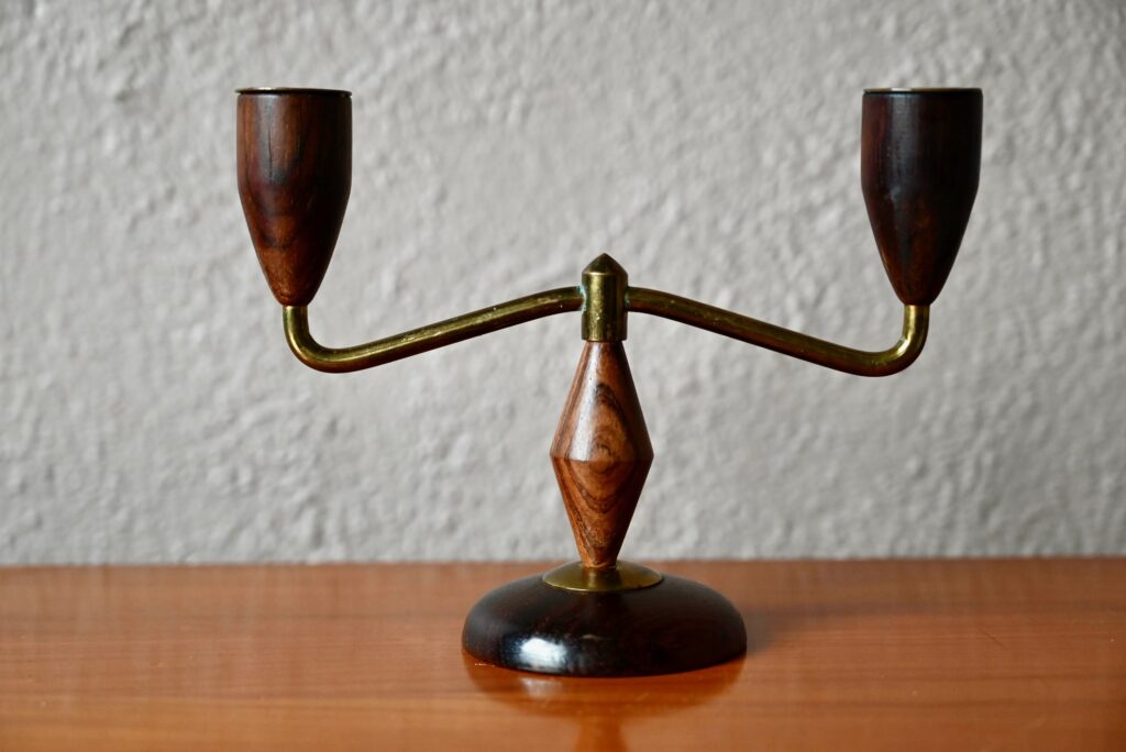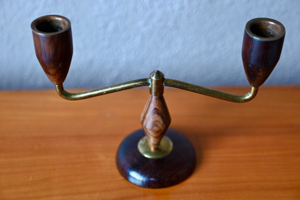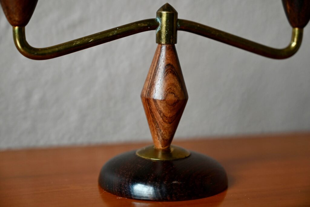 Le bougeoir double est en bois exotique et métal doré. Il est fonctionnel, en bel état. Quelques traces du temps sont visibles à la surface du métal.