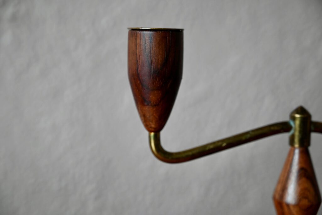 Production danoise milieu de siècle, ce chandelier est réalisé en laiton et palissandre. Nous aimons son style profondément scandinave et sa jolie forme déployée, détails qui en font une pièce déco intéressante.