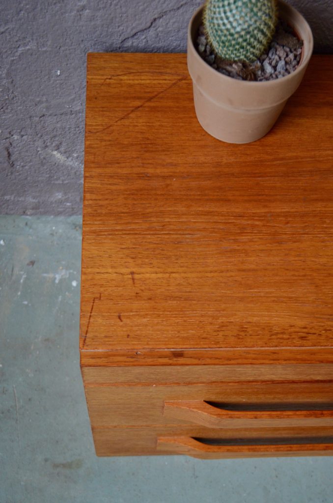 Le meuble date des années 70, il est doté de 2 larges tiroirs. Les poignées de bois décorent la façade. Le meuble est en bon état, quelques légères traces d’usage sont visibles dont de fines rayures. Le meuble bas est parfaitement fonctionnel.