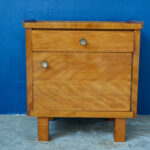 Gros chevet ou mini-commode, ce petit meuble vintage se glissera dans tous les espaces réduits. Nous apprécions sa silhouette cubique, adoucie par le travail et la teinte chaleureuse du bois. Doté d’un tiroir et d’un caisson de rangement, il sera parfait en table de nuit, bout de canapé ou petit meuble d’accueil dans une entrée.