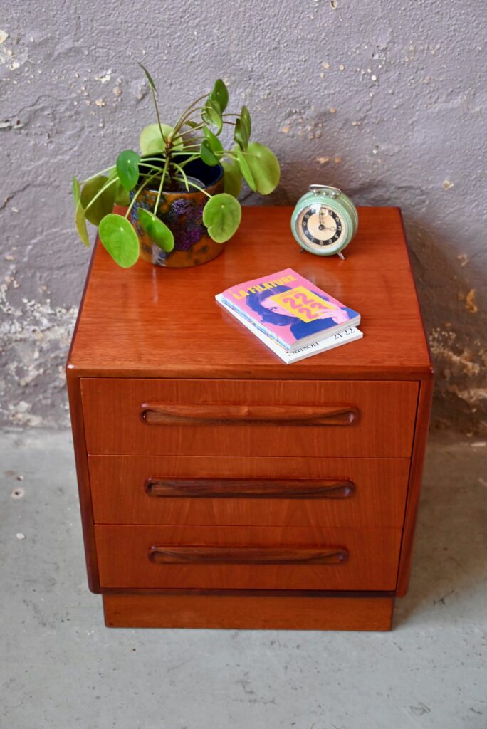 Ce caisson à tiroirs ou table de chevet en teck est une production de l’éditeur anglais “G-Plan”. Dessiné par Viktor Wilkins, il s’exprime dans un pur style scandinave, avec ses angles adoucis et la mise en valeur du travail du bois. C’est un petit meuble, tout bois, qui évoque un confort chaleureux et la douceur de vivre. Le format relativement important du caisson autorise une utilisation en rangement d’appoint, mini-commode ou bout de canapé.