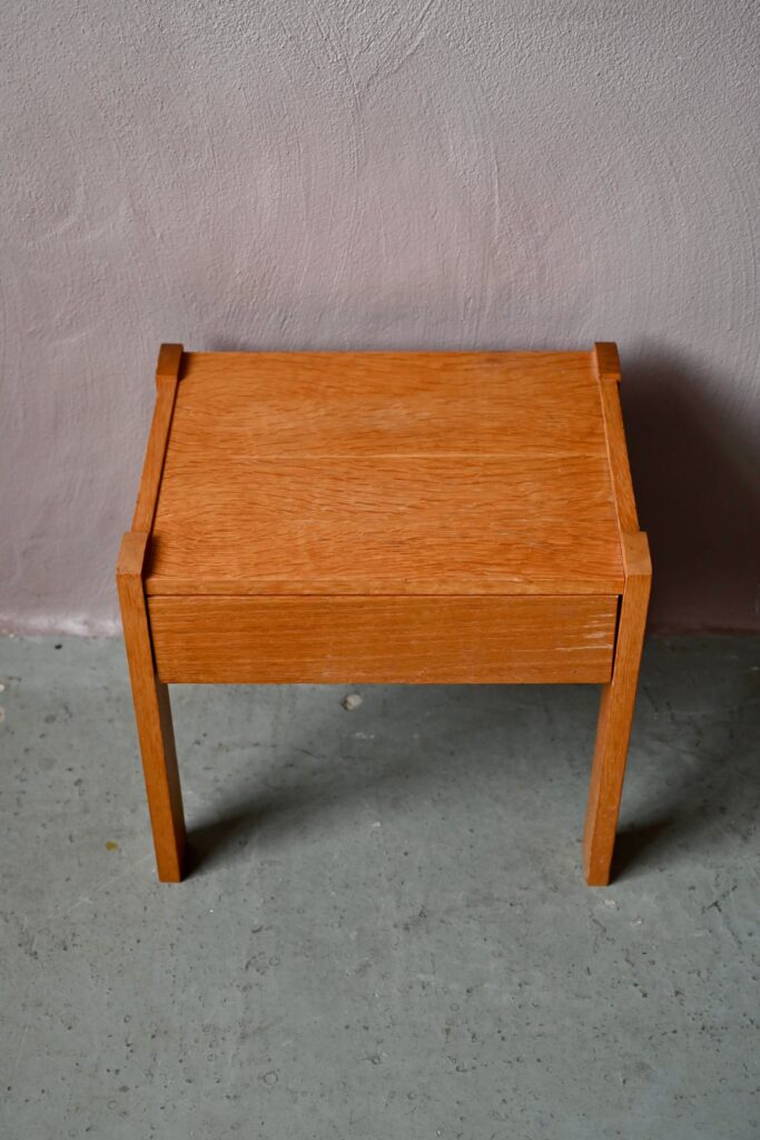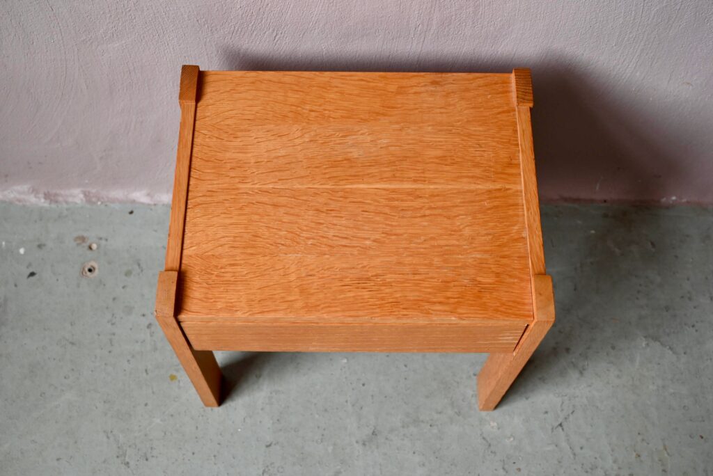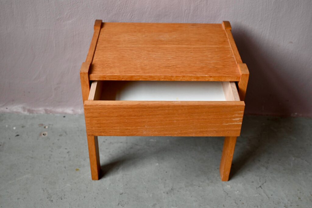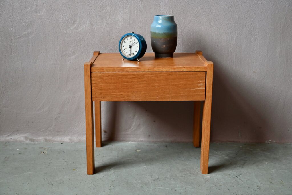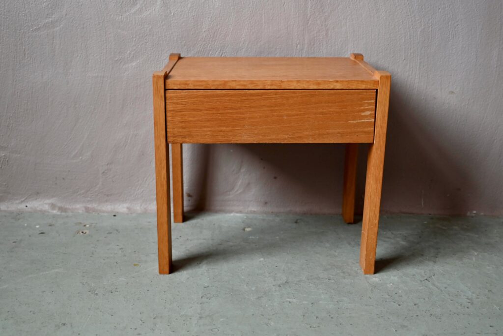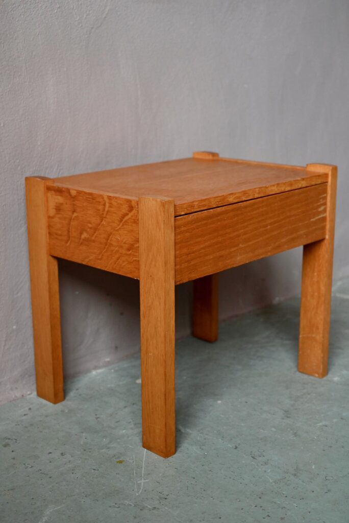 Le chevet date des années 70. Il est en bel état. Minimaliste, piétement, tiroir et plateau sont en bois et placage de teinte dorée. L’ensemble est en bel état, quelques traces d’usage sont visibles en photo, notamment sur le tiroir.