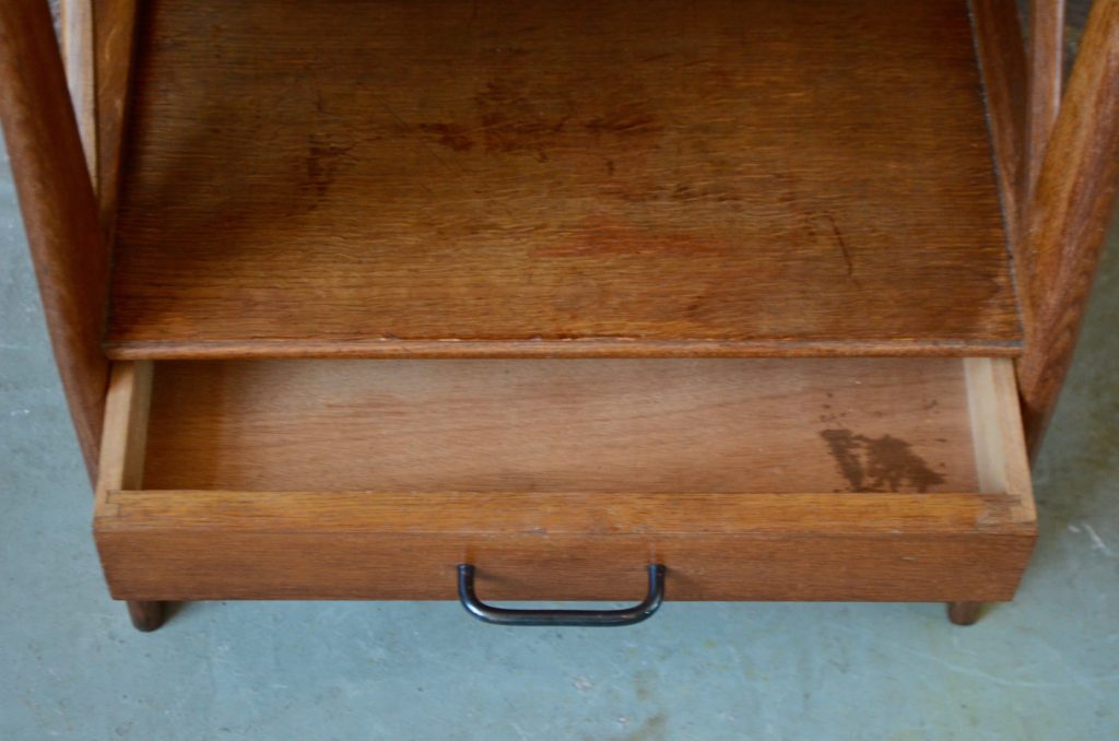 Ce chevet est une production des années 50 par les ateliers Saint Sabin. Son dessin s’inspire des grands décorateurs de l’entre-deux-guerre et du style directoire, le tout modernisé par l’effervescence créative du milieu du siècle. De très belle fabrication, il est réalisé en chêne, est doté d’un tiroir, d’une vaste niche et d’un plateau. Ses flancs sont habillés par des croisillons. Petit meuble inclassable, au design exigeant et intéressant, il porte en lui une modernité nécessaire, toujours actuelle.