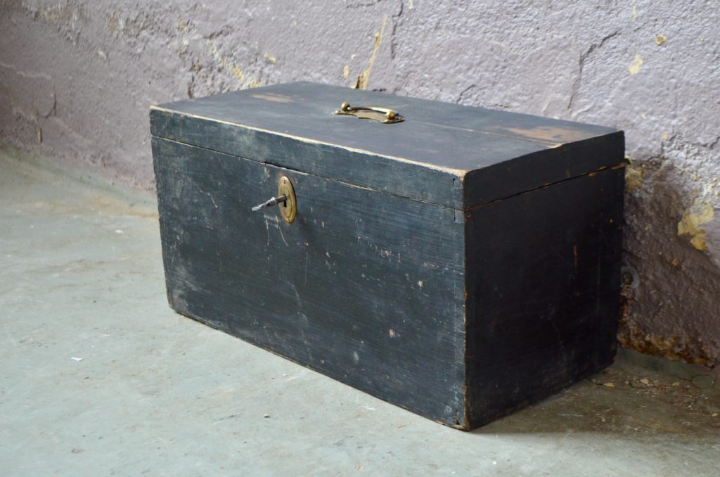 Le coffre est en bois massif, la peinture vert foncé noir est d’origine, intensément patinée. La serrure, l’entrée, la clef et la poignée sont d’origine, en laiton. La serrure est fonctionnelle. L’ensemble est propre et en bel état.