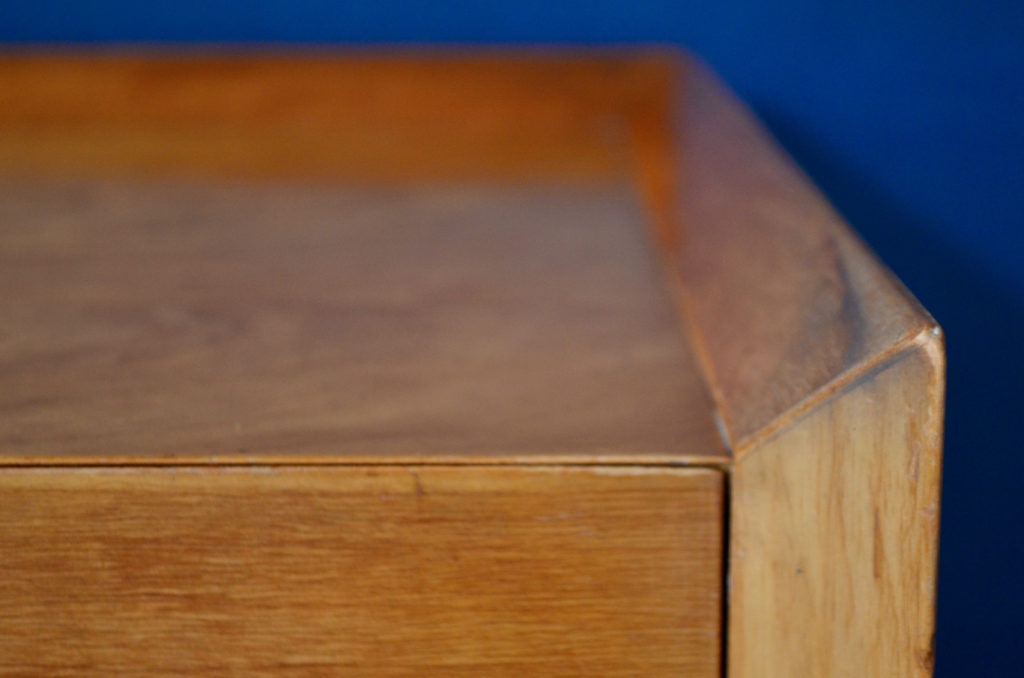 La console est ancienne et date des années 50. Elle est en orme, d’une superbe teinte dorée claire. Le lustre est superbe et le travail de dessin et d’assemblage l’oeuvre d’un grand ébéniste. Les arêtes du meubles sont saillantes et débordantes. Le meuble est en bois massif et placage, il est très lourd, costaud et en superbe état. Il comprend 6 très grands et hauts tiroirs, la façade des 2 tiroirs supérieurs étant en trompe l’oeil. Ils comportent un compartiment et un vide poche coulissant. Les poignées épaisses en métal doré sont d’origine, très belles et originales. Les traces d’usage sont discrètes, un très petit manque de bois est à noter sur l’arête arrière du plateau et arête basse gauche. Les tiroirs coulissent parfaitement.
