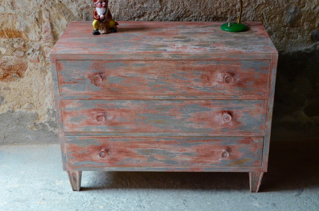 Nous ne comptons plus les couches de peinture sur cette commode ancienne ! Patinée par nos soins avec des pigments naturels liés à la caséine, le vieux rose se mêle au blanc crème, à l’argenté, au rouge… La patine est profonde et confère beaucoup de grain à la commode. Pieds joliment travaillés, boutons en bois tourné, trois tiroirs profonds, elle se révélera le rangement idéal dans une ambiance bohème ou shabby chic. Cette commode ancienne semble avoir eu 1000 vies, et au moins autant d’histoires à nous conter…