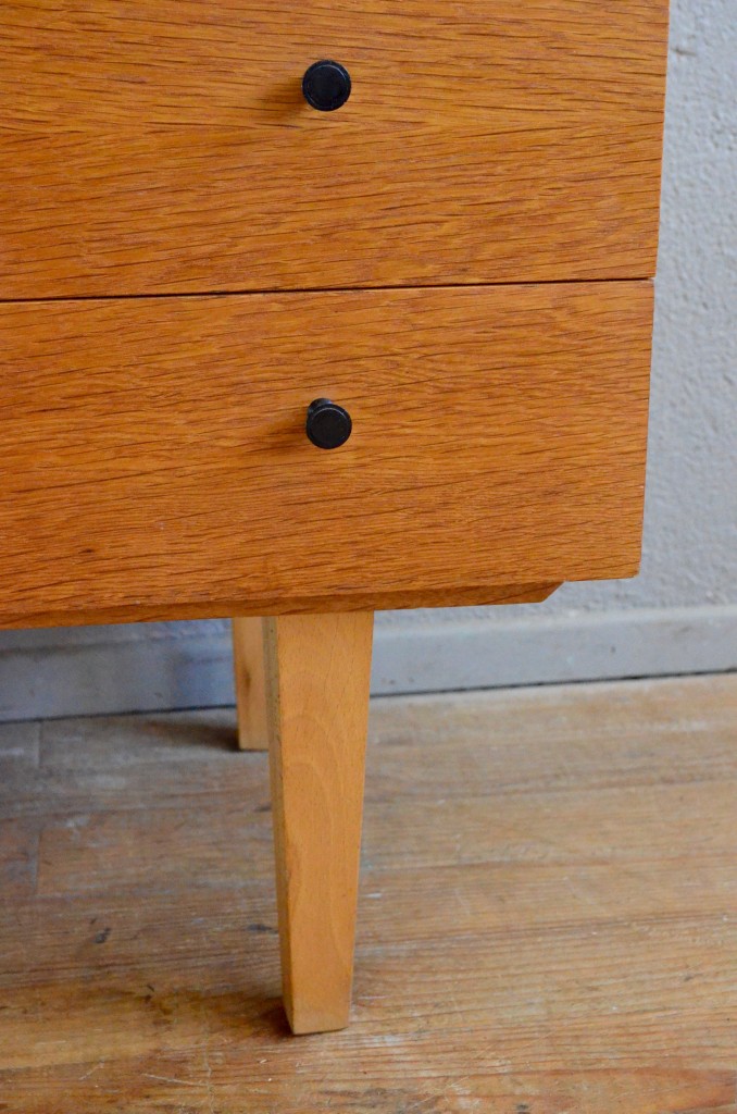 La commode est en chêne et placage chêne de teinte dorée. Elle dispose de 3 grands tiroirs et de boutons en bakélite noire. Quelques traces d’usage sont à noter sur le plateau, visibles sur les photos. Stable et de belle facture, la commode est en bel état.