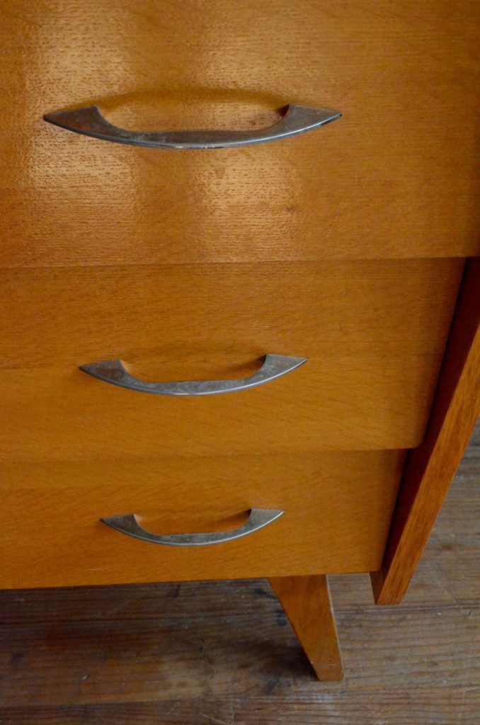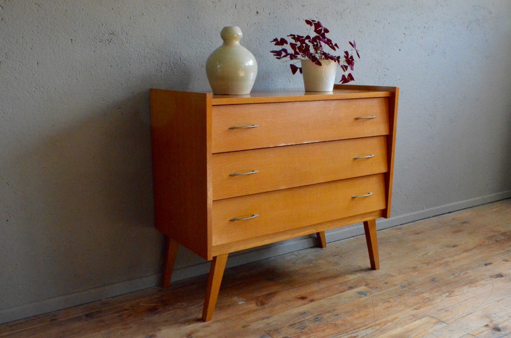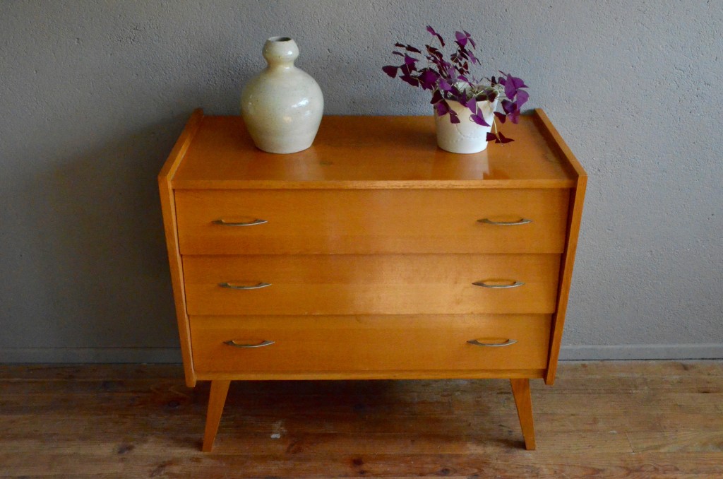 Chaud devant! Cette commode-là a tout ce qu’on aime! Le piétement compas prend un peu de hauteur et assure élégance et légèreté à ce meuble des années 60. Façades de tiroirs inclinées, poignées d’origine et chants des panneaux latéraux saillants et obliques apportent dynamisme et originalité à l’ensemble. Au nombre de 3, les tiroirs sont hauts et permettront d’ordonner facilement les piles de linge! Enfin, la teinte du bois est douce et lumineuse! Dans l’entrée ou la chambre, cette commode attirera l’oeil!