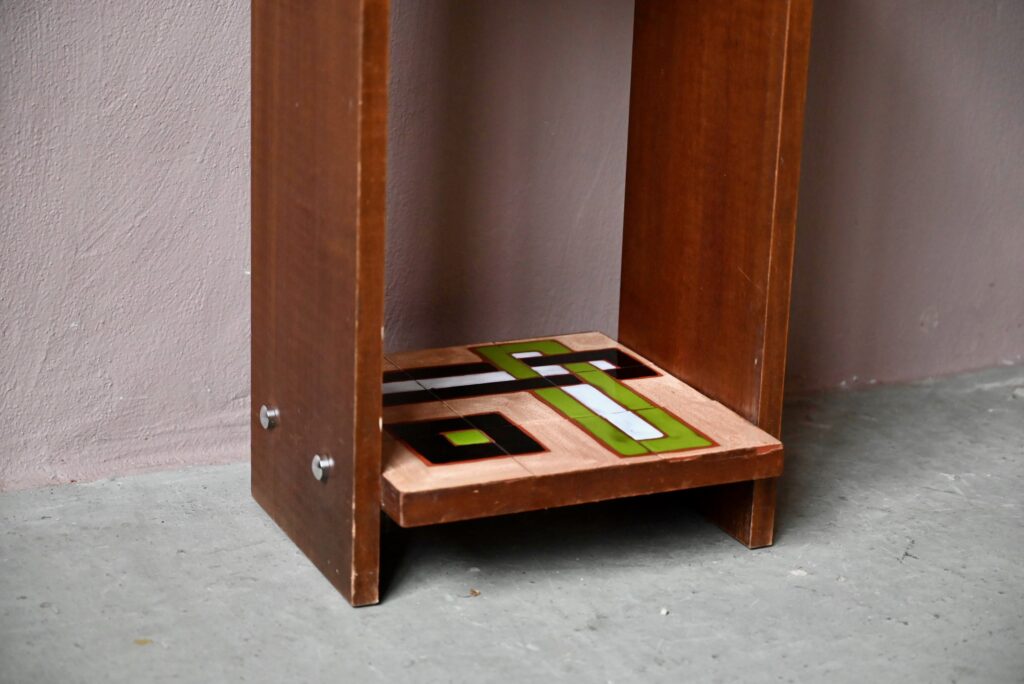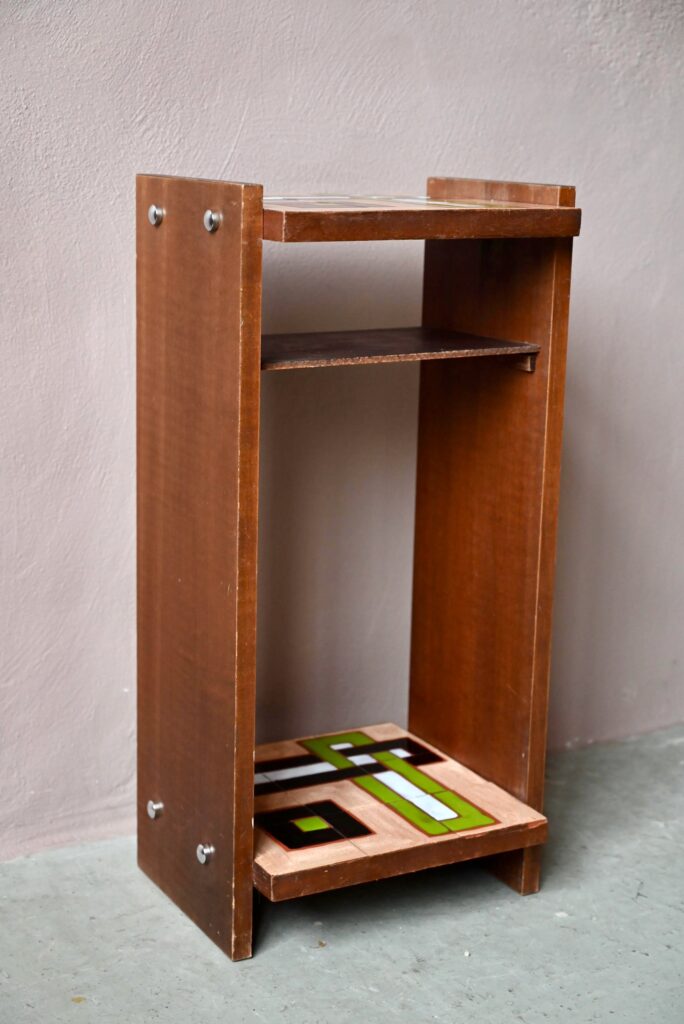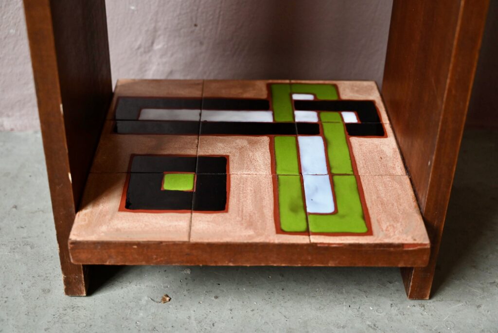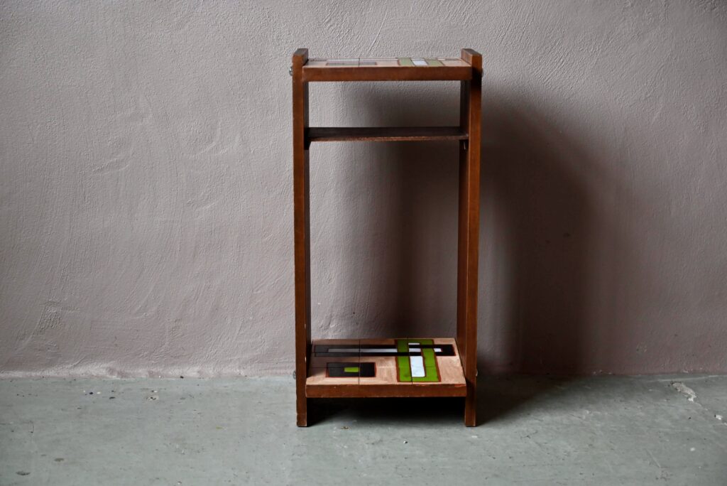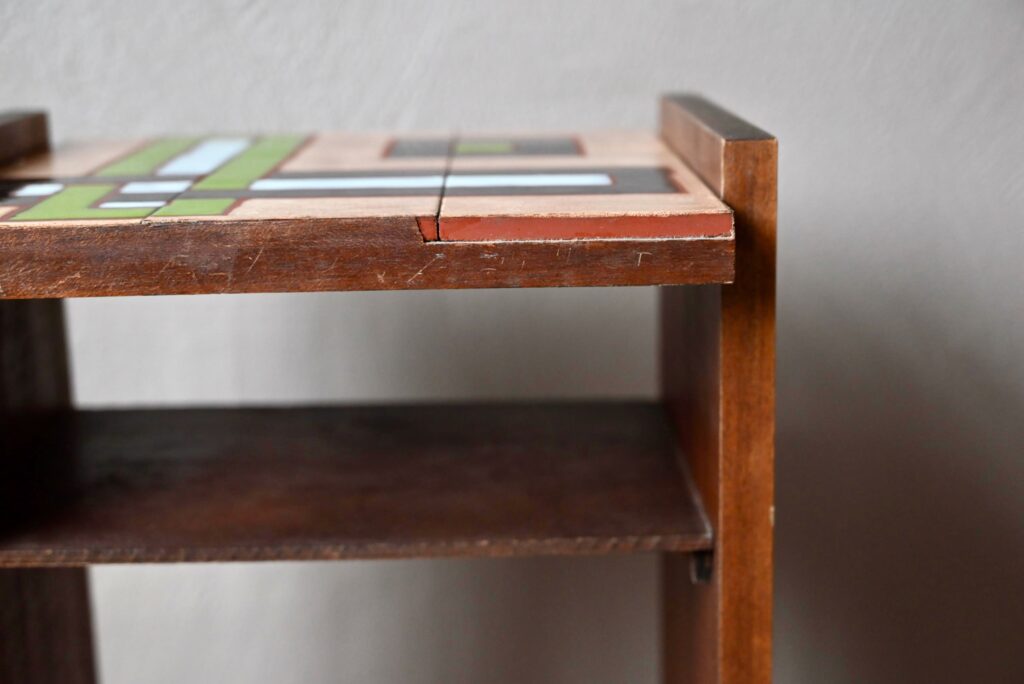 Le piétement de la console est en bois placage de teinte profonde, sobre et élégant. Les plateaux sont composés de superbes carreaux de céramique, l’émail coloré est profond. Des traces d’usage sur le piétement sont visibles, ainsi que des traces manques de chant. La petite console est fonctionnelle et déco. Des caches-vis en chrome brillant sont présents sur les flancs.