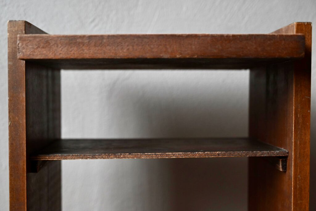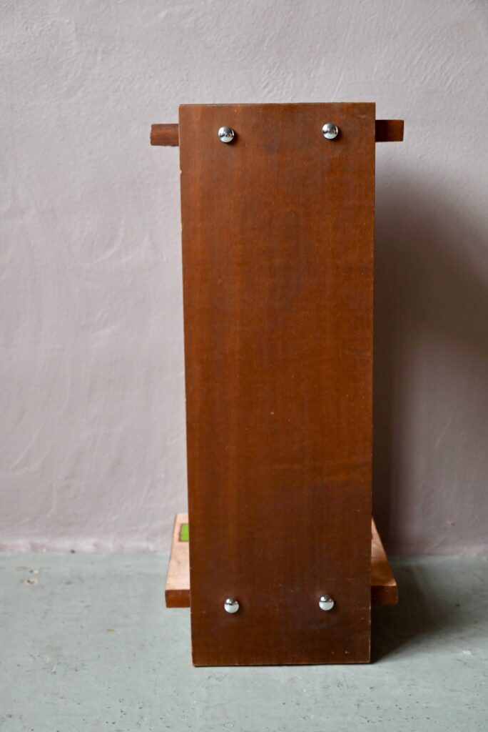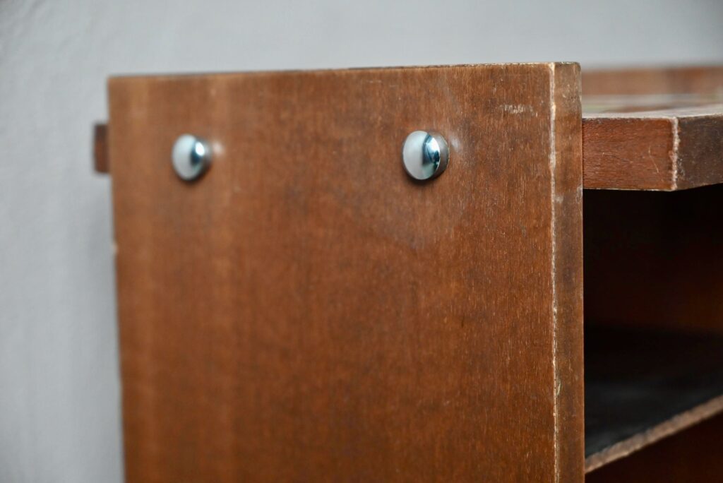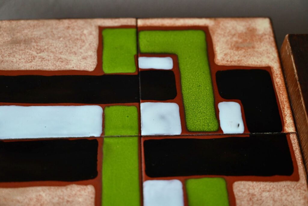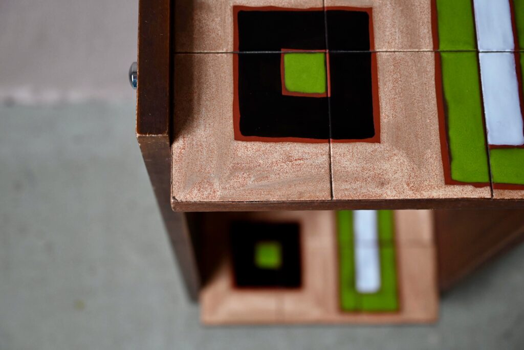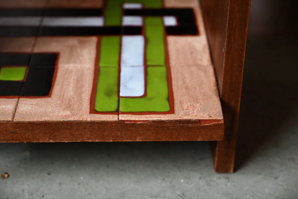 Le piétement de la console est en bois placage de teinte profonde, sobre et élégant. Les plateaux sont composés de superbes carreaux de céramique, l’émail coloré est profond. Des traces d’usage sur le piétement sont visibles, ainsi que des traces manques de chant. La petite console est fonctionnelle et déco. Des caches-vis en chrome brillant sont présents sur les flancs.