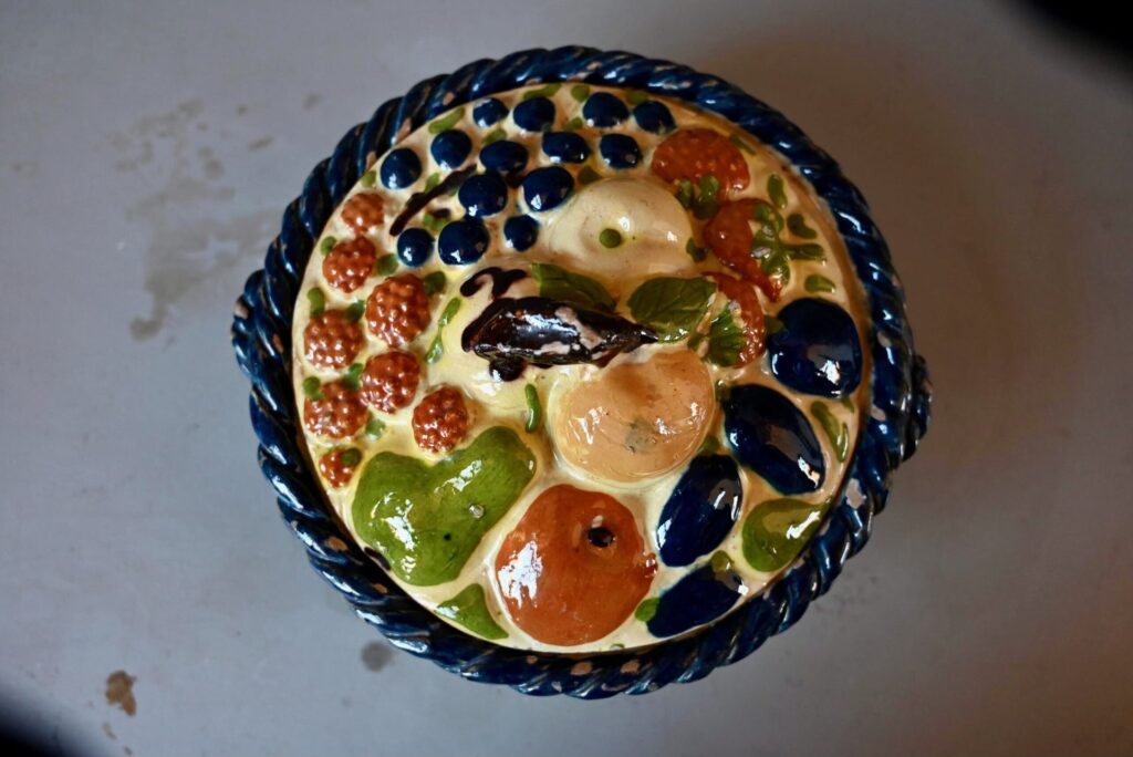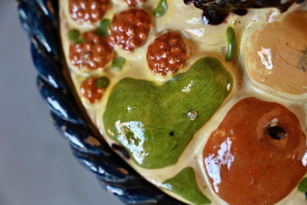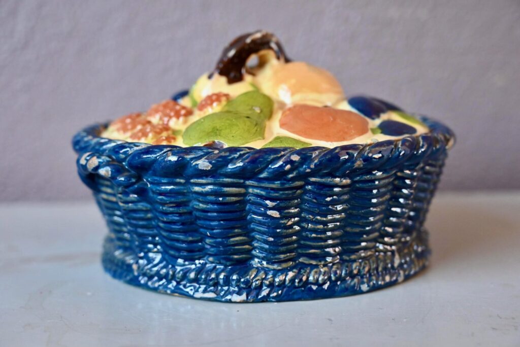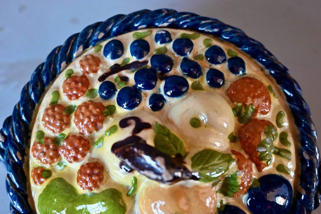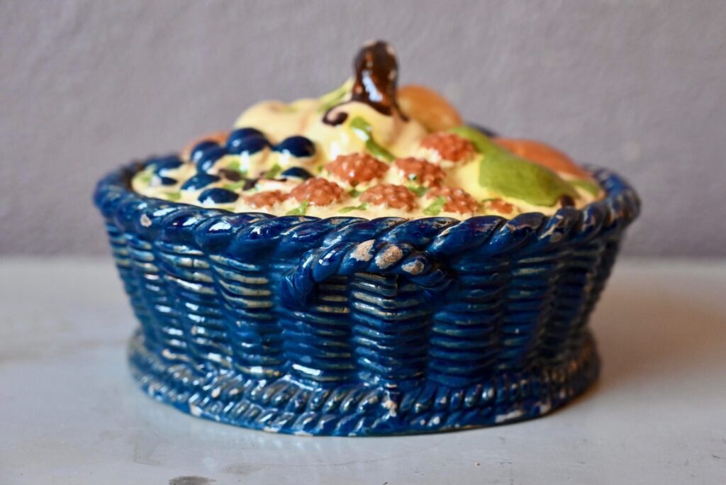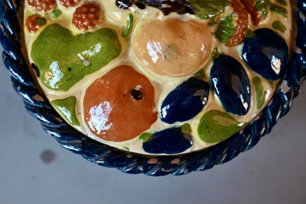 Cette magnifique corbeille à fruits en terre cuite polychrome mêle les fruits des vergers alsaciens : raisin, poires, pommes, quetsches, framboises et autres douceurs en trompe-l’œil. Joliment vernissée et colorée, ce saladier à couvercle est d’une douceur touchante.