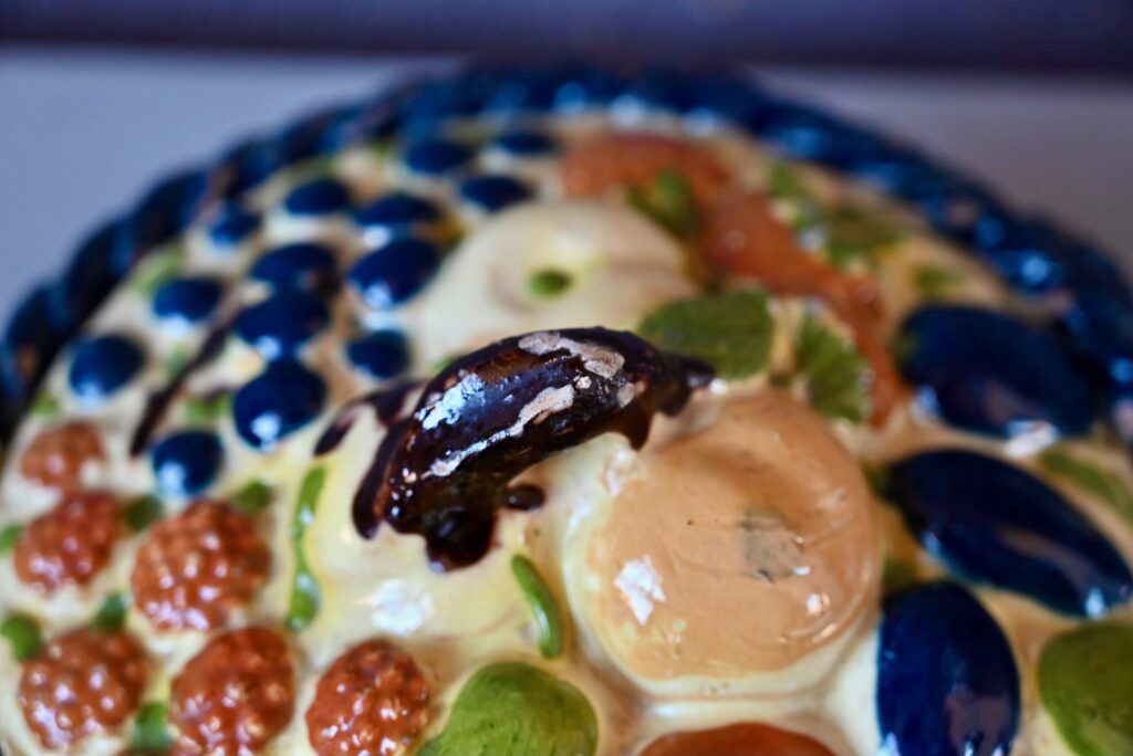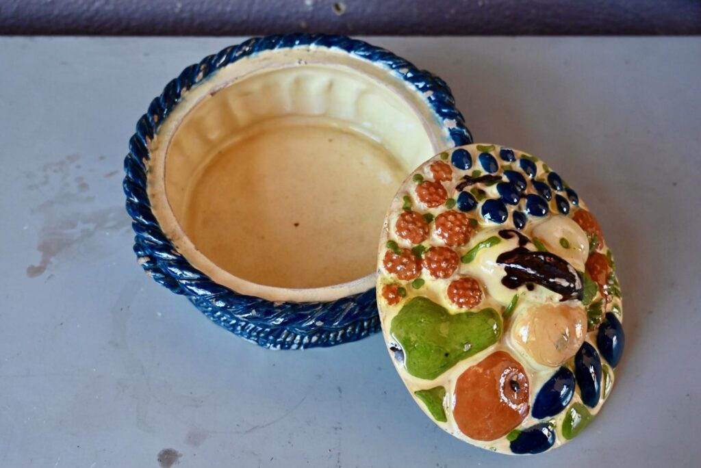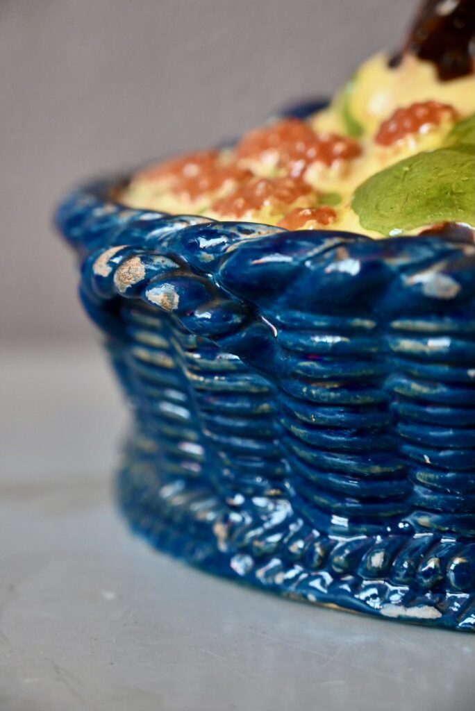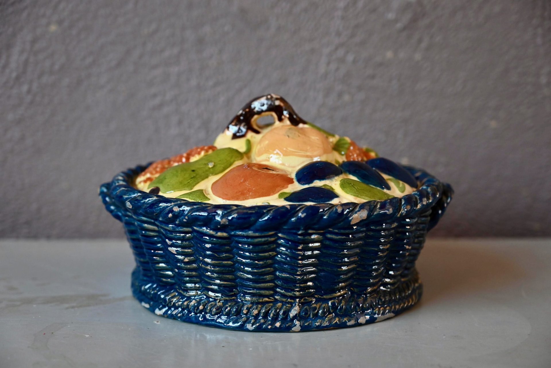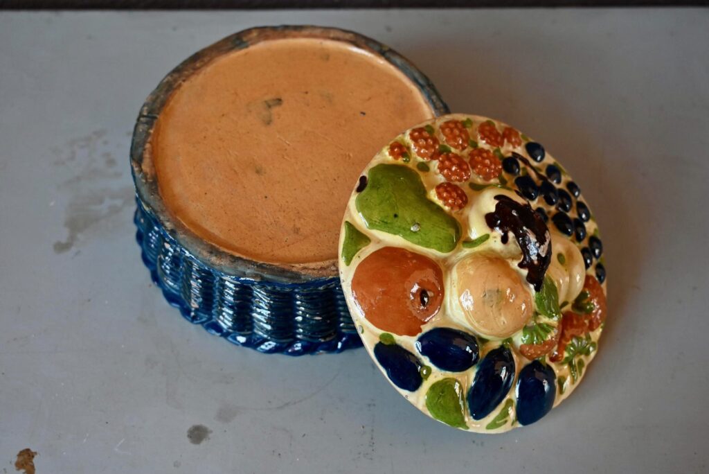 Cette magnifique corbeille à fruits en terre cuite polychrome mêle les fruits des vergers alsaciens : raisin, poires, pommes, quetsches, framboises et autres douceurs en trompe-l’œil. Joliment vernissée et colorée, ce saladier à couvercle est d’une douceur touchante.