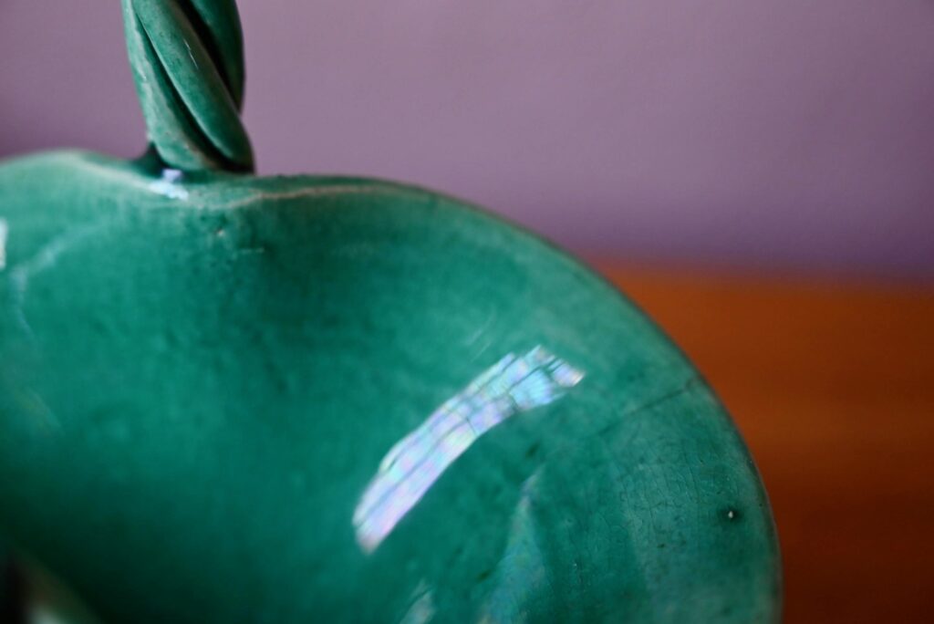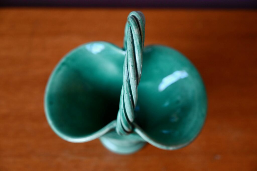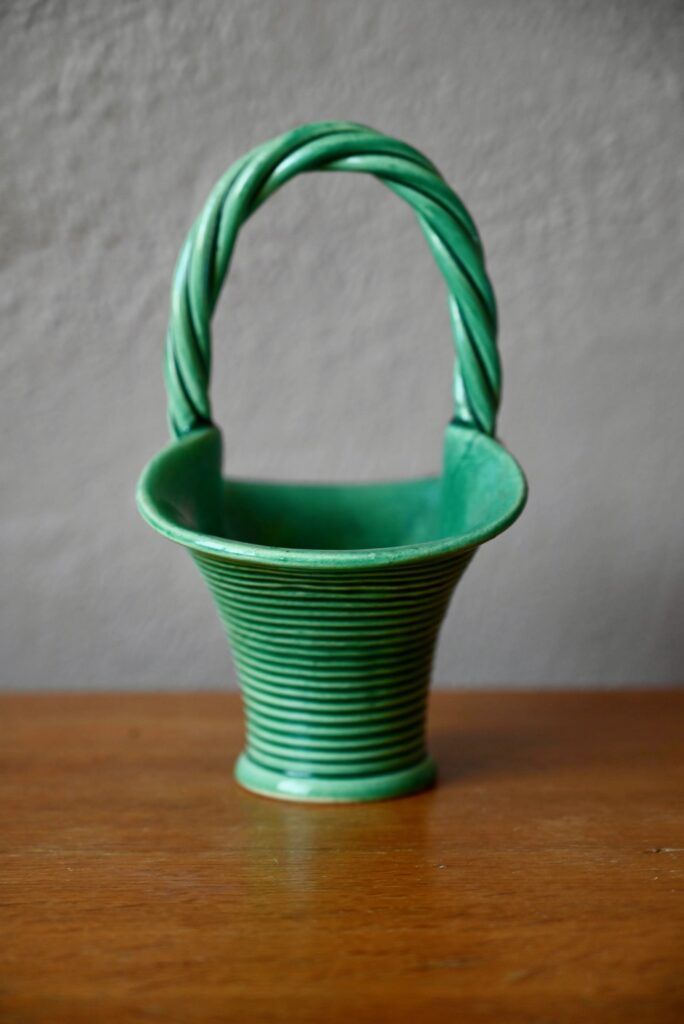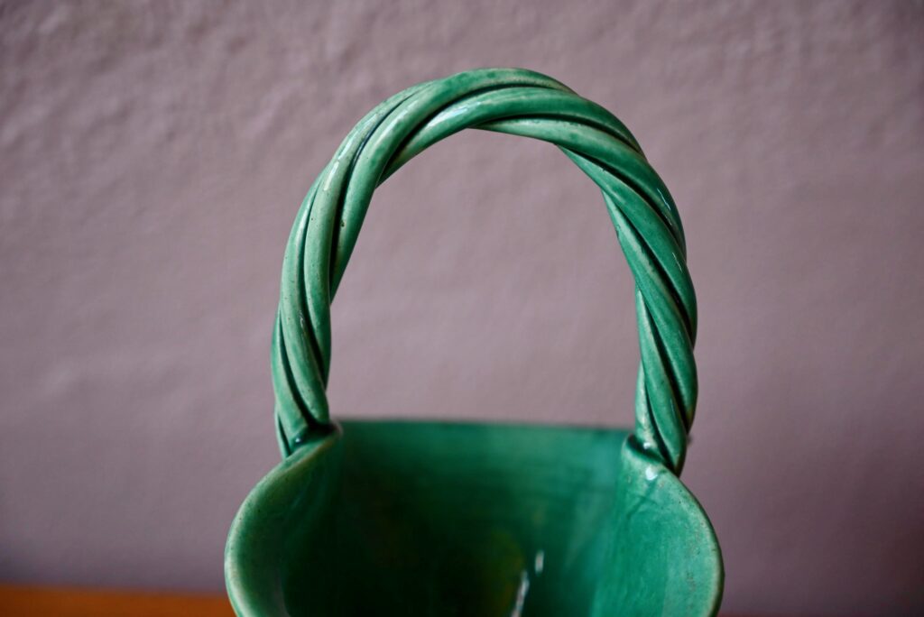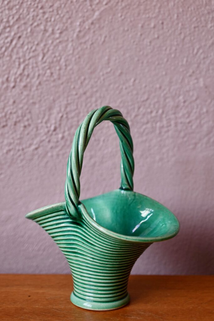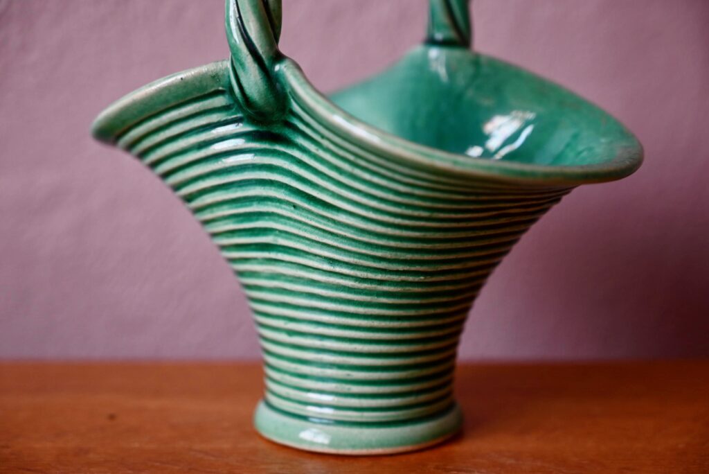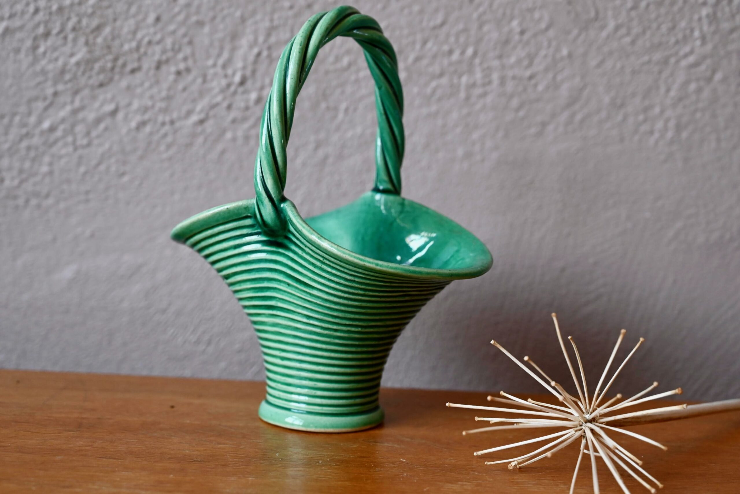 Cette jolie coupe est une pièce de déco bohème des années 50. En forme de corbeille annelée, elle est dotée d’une anse tressée. L’émaillage vert est lumineux. La coupe pourra être utilisée en vide-poches, pots à crayons ou petit vase poétique.