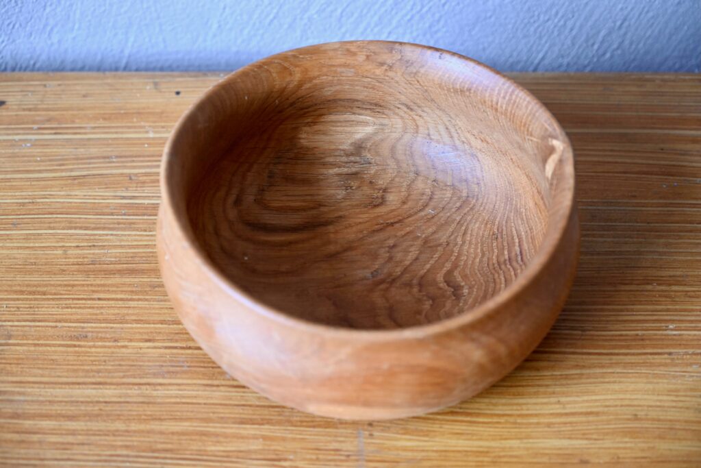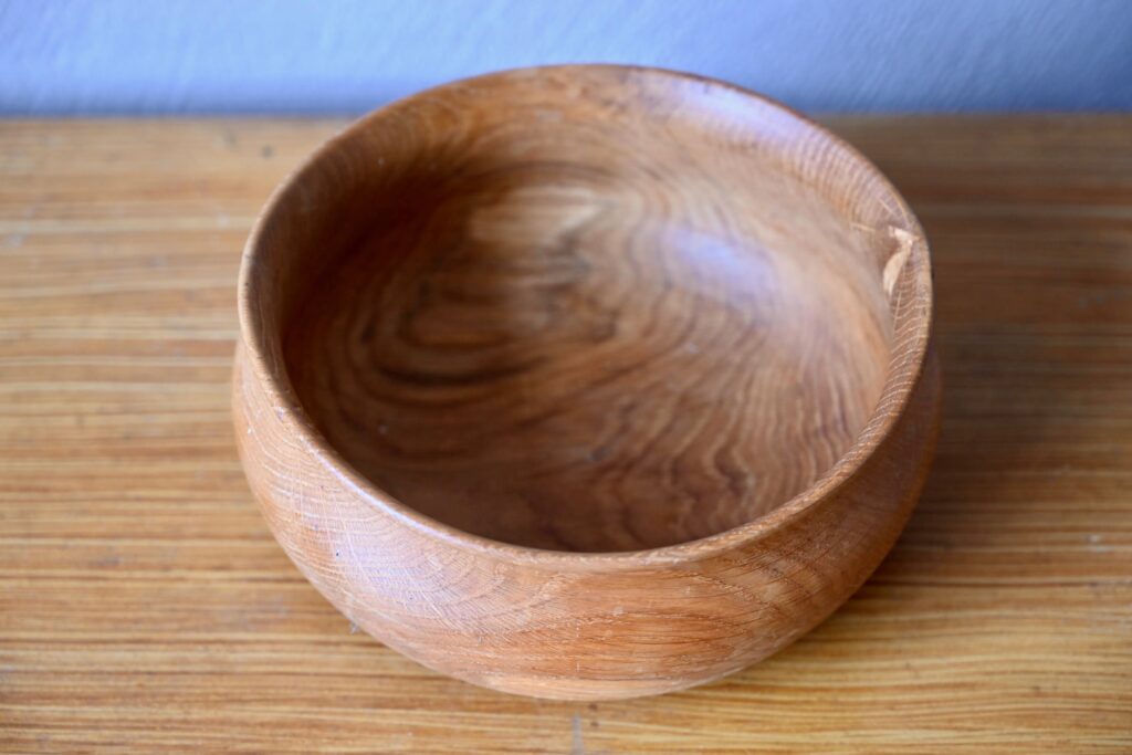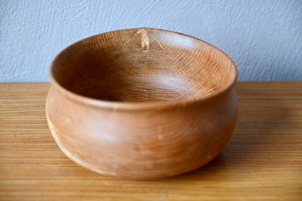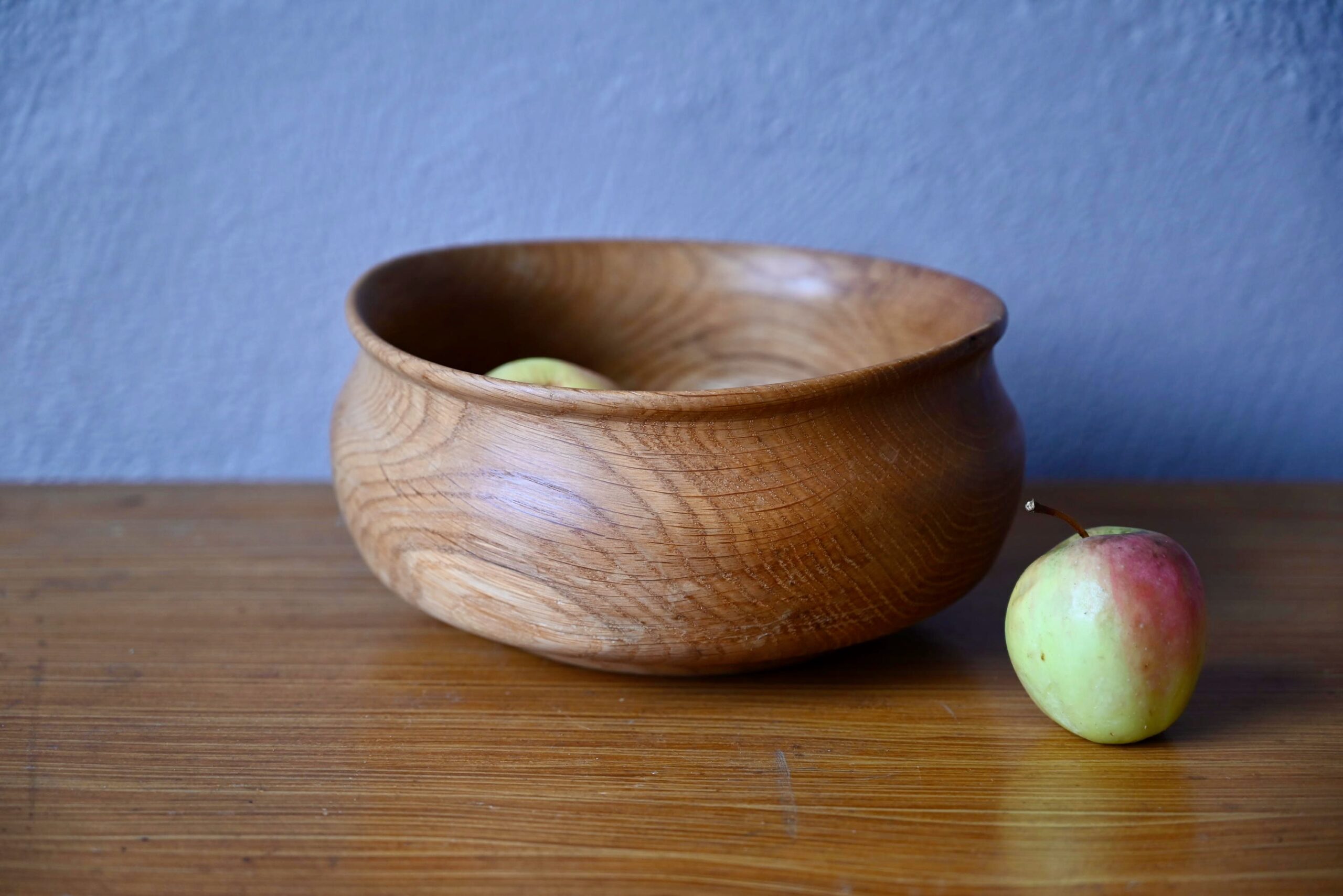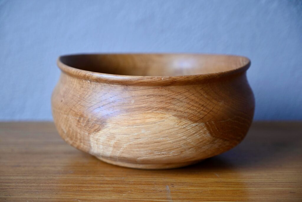 La coupe est en chêne subliment tourné. De fabrication artisanale danoise, le saladier a une forme irrégulière et un bord joliment ourlé. Il est en parfait état, une étiquette du sculpteur est présente.