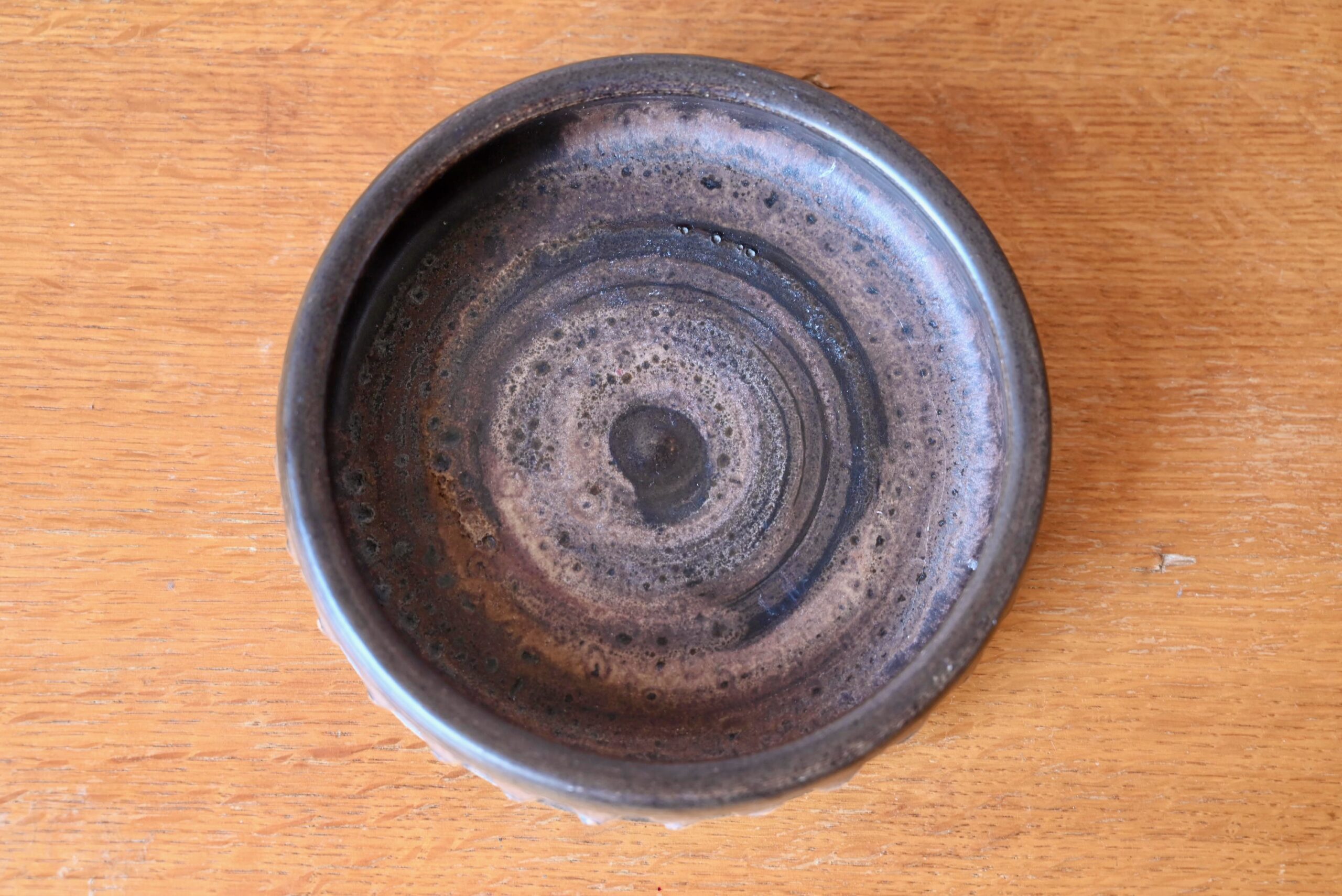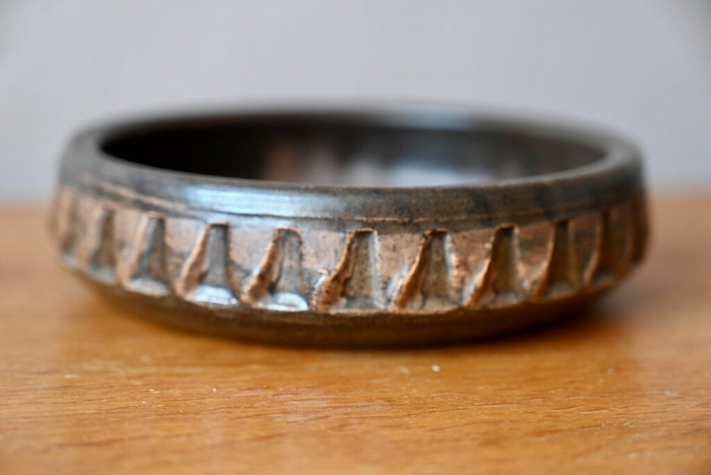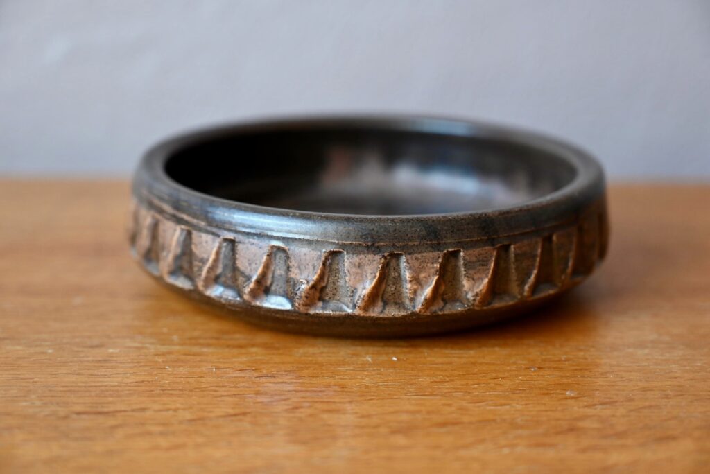 Cette belle coupe danoise des années 60 est réalisée en grès émaillé mat, dans des tons marron, proches de la terre. le contour et ses scarifications apportent du relief à la pièce. Le vide-poches présente une esthétique sobre, brute, dans un esprit wasi sabi.