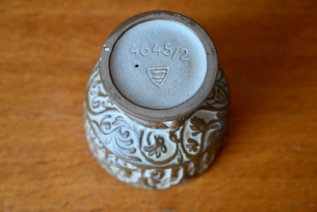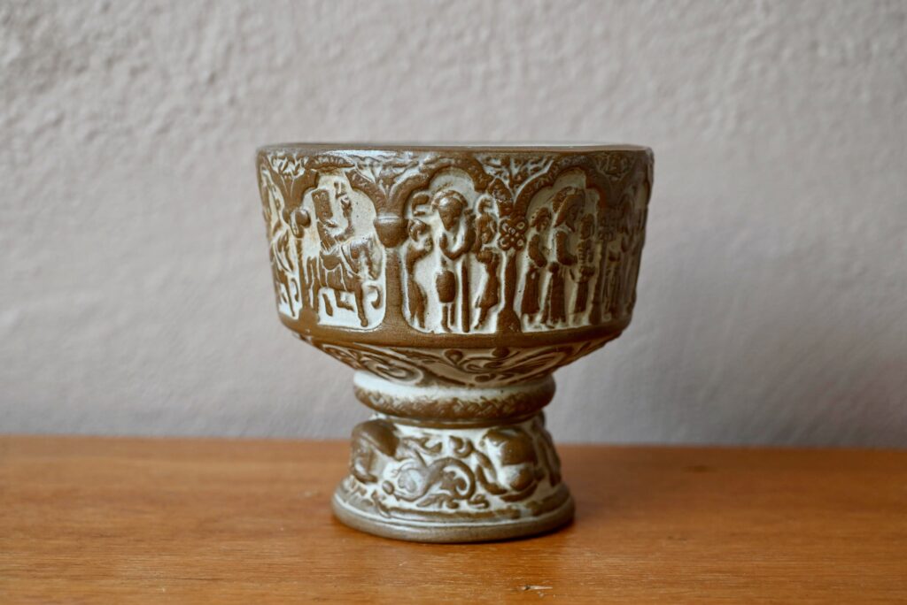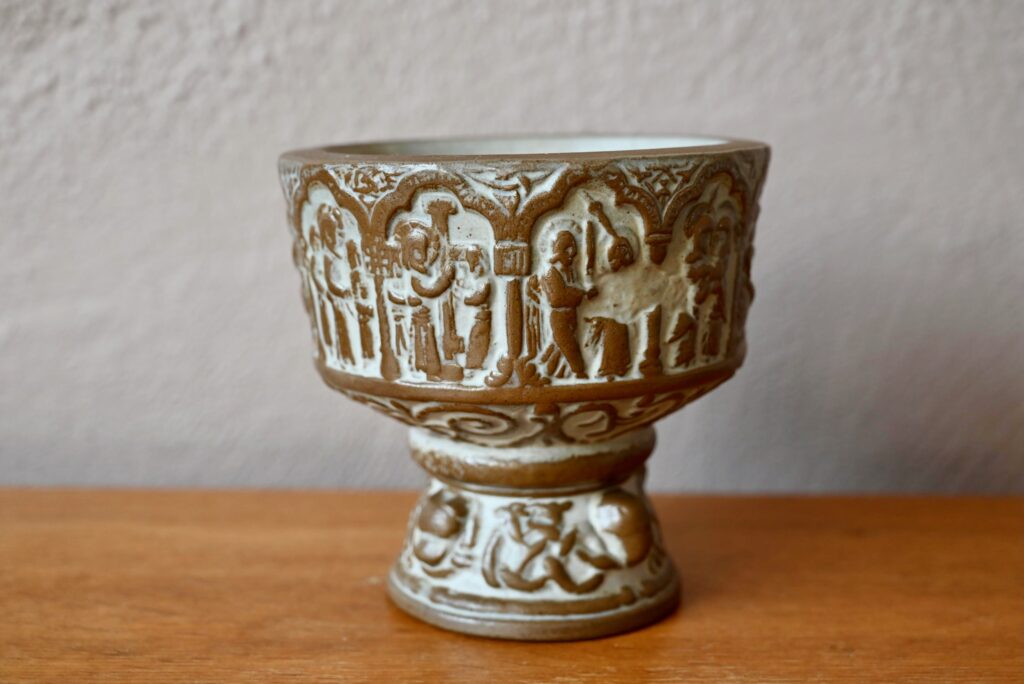 Cette belle coupe danoise des années 60 est réalisée en grès, par Michael Andersen à Bornholm. Elle est une réplique d’une coupe de baptême présente en l’église danoise Aa Kirke. Chaque réplique est unique. Le potier a su tirer parti de la matière, le contraste entre la céramique brune et la peinture claire fait ressortir la délicatesse des motifs. La coupe présente une esthétique sobre, brute, dans un esprit wasi sabi.