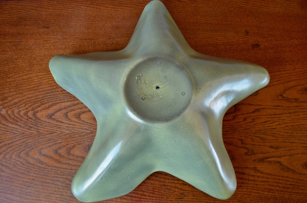 La céramique est de grande taille, elle porte la trace d’une mauvaise restauration sur une des branches de l’étoile. La pièce porte une signature manuscrite, en creux ainsi que son étiquette d’origine.