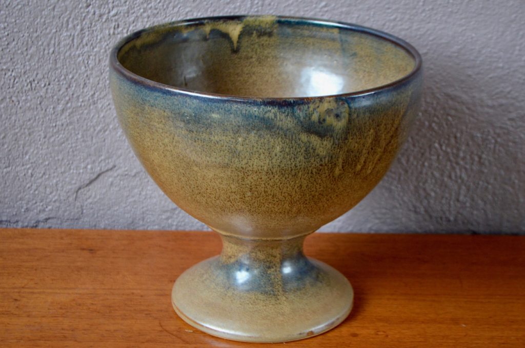 Cette imposante coupe en grès, est une production de Michel Pointu, fils et petit-fils de potiers de renom installés en Puisaye, et de son épouse Denise Pointu-Detraz. Cette coupe est une production de la fin des années 50, début soixante. Sculpturale, de grandes dimensions, elle est remarquable de présence. Sa surface nuancée, mouchetée confère un charme brut à cette belle pièce.