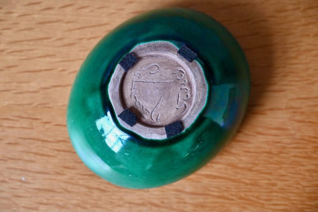 Cette coupe midcentury est l’œuvre de René Hénon, fondateur des ateliers de céramique “Kéramos” à Sèvres. Le travail d’émaillage est superbe, d’un vert intense, profond et transparent à la fois. Son design organique et sa forme libre sont intemporels et élégants. Utilitaire en vide-poches ou simplement décorative, cette céramique est une pièce marquante.