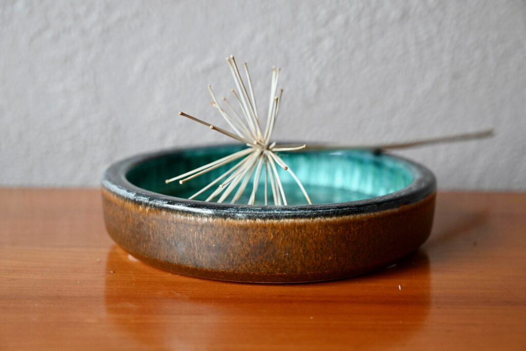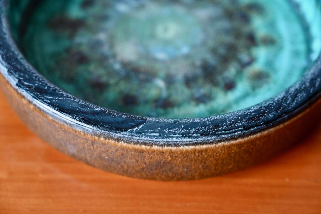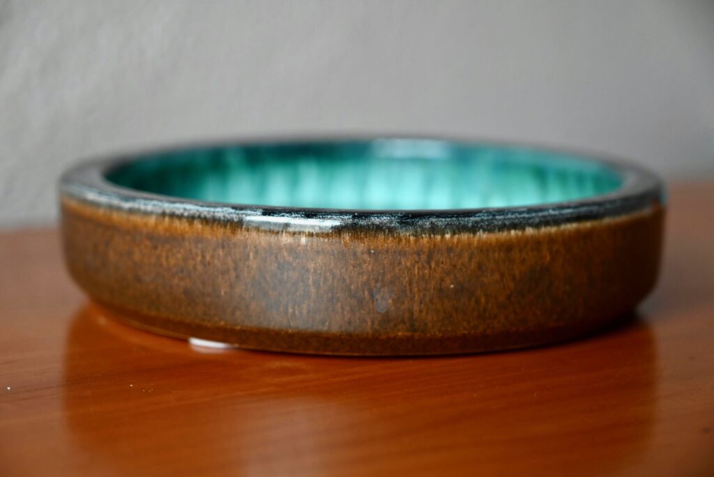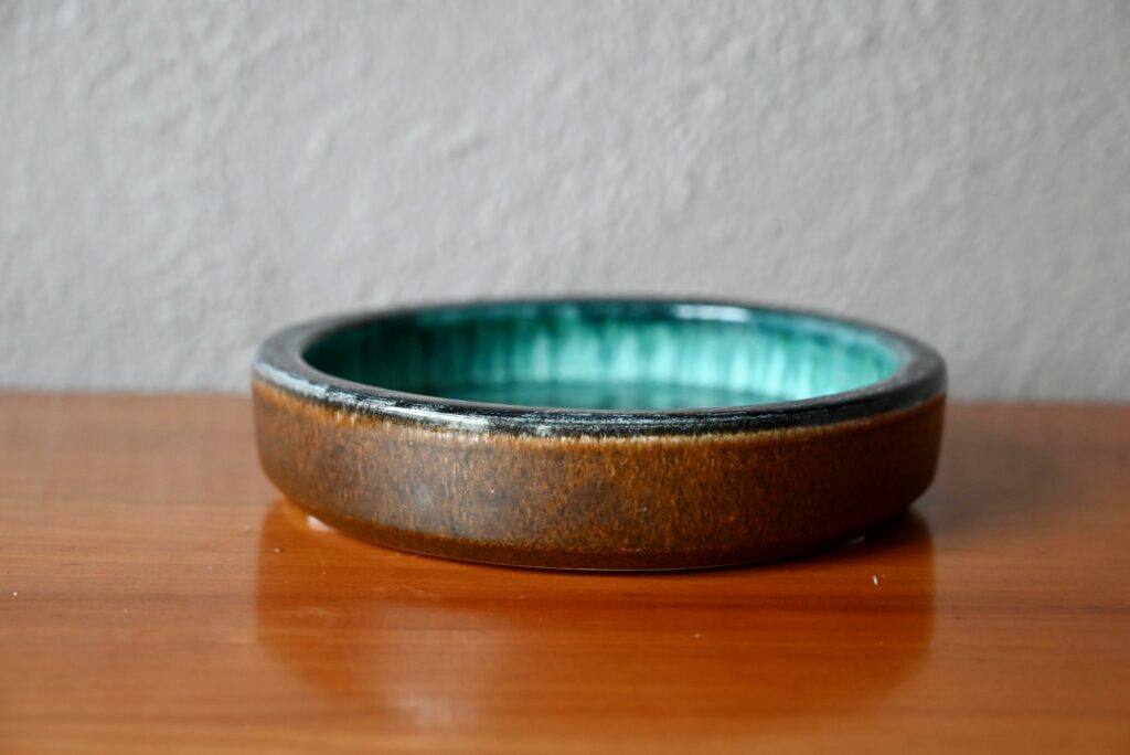 Cette jolie coupe danoise Ting Keramik est réalisé en grès émaillé. L’extérieur sombre et mat met en valeur la teinte brillante et lumineuse de l’intérieur, dans des tons bleu-vert. Le vide-poches présente une esthétique sobre, dans un esprit wabi-sabi. Nous l’imaginons pièce décorative sur un beau meuble dans le salon, coupelle à bijoux ou vide-poches sur la commode de l’entrée.