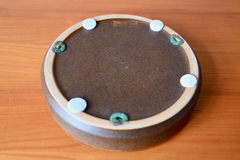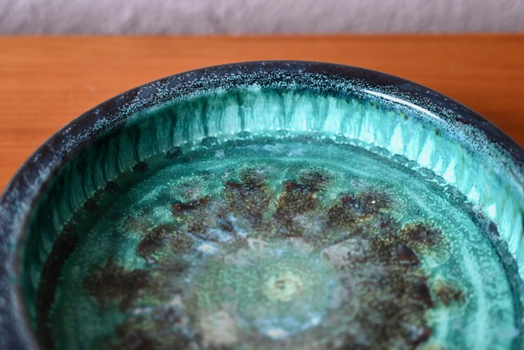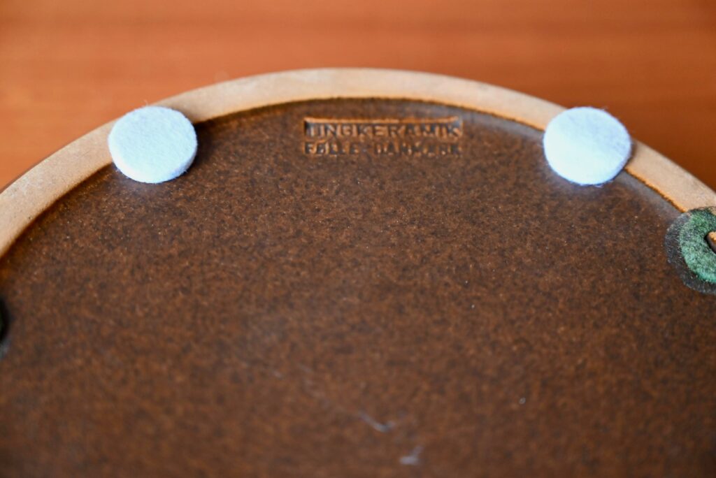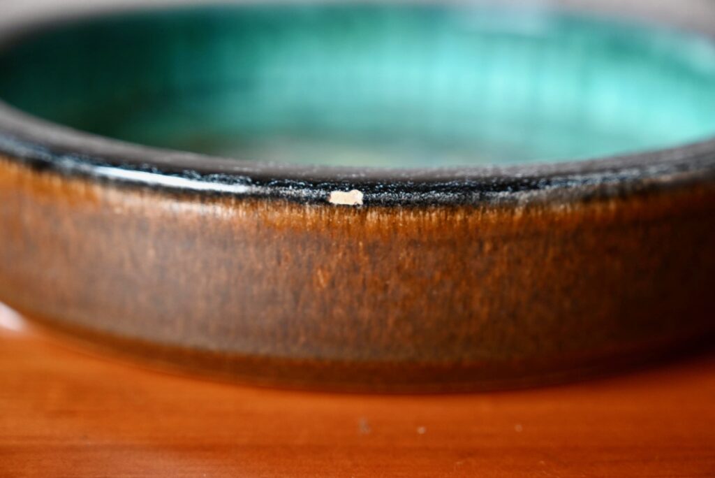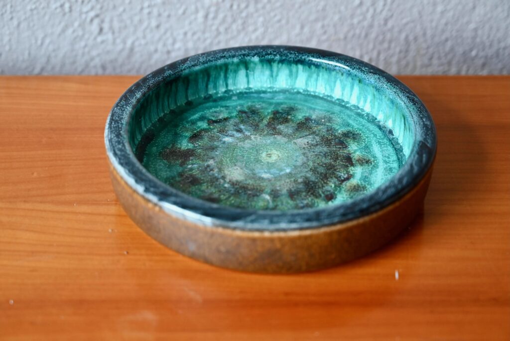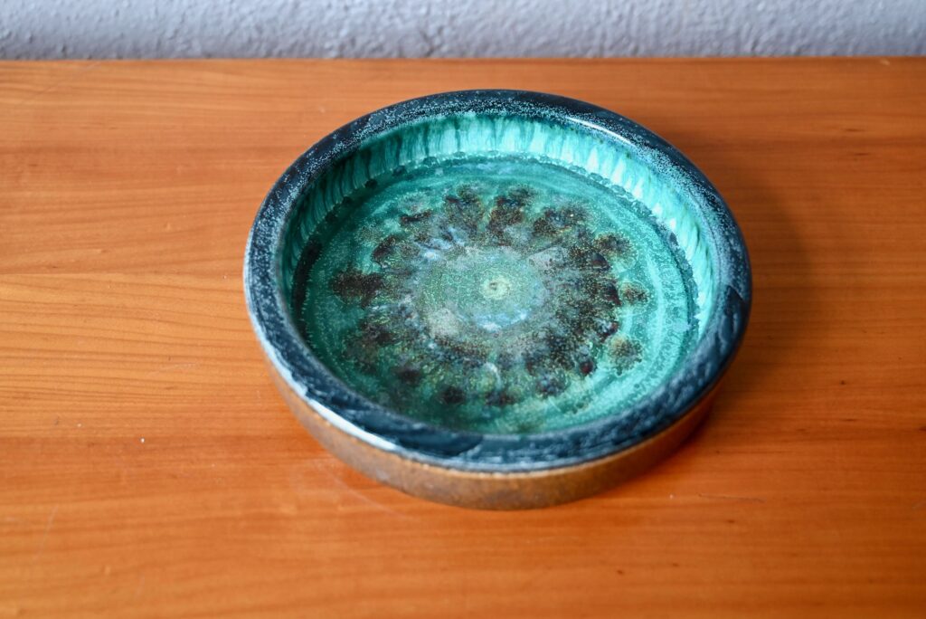La coupelle date des années 70 et provient du Danemark. Elle est estampillée sur le dessous. Elle est en grès émaillé de belle facture, un discret manque est à noter, visible en photo.