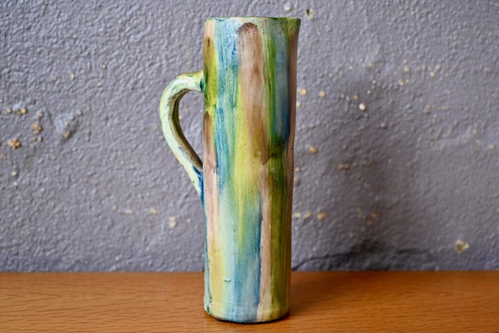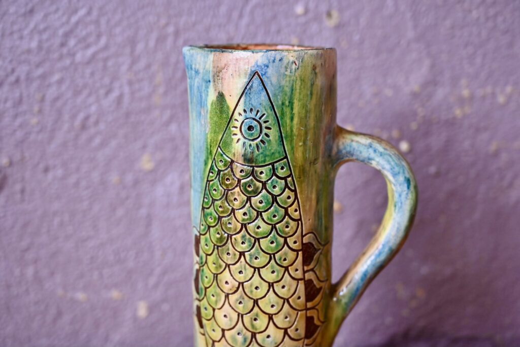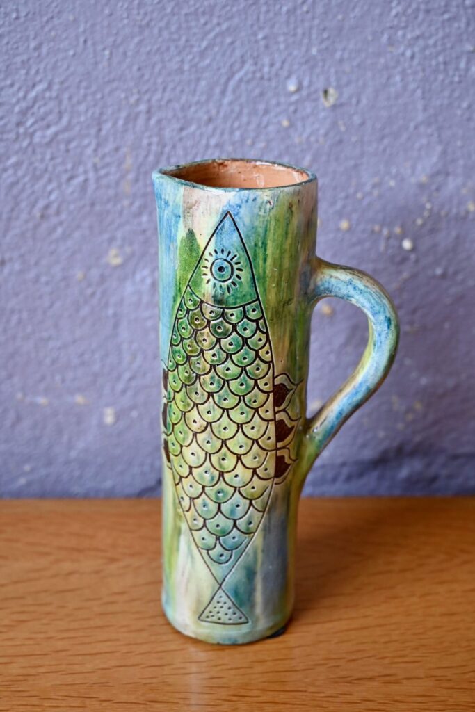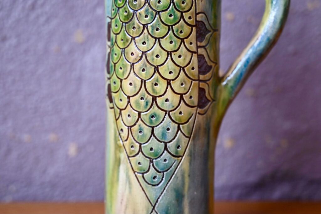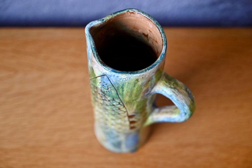 Ce pichet de belles dimensions tire son inspiration de la nature. Dans des tons délavés de vert-bleu-marron, la cruche en terre cuite est nervurée d’un poisson noir en relief. Impressionnante et brillante, c’est une pièce décorative et usuelle intéressante.
